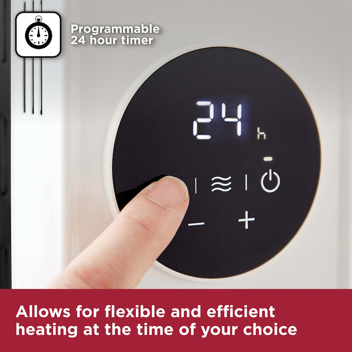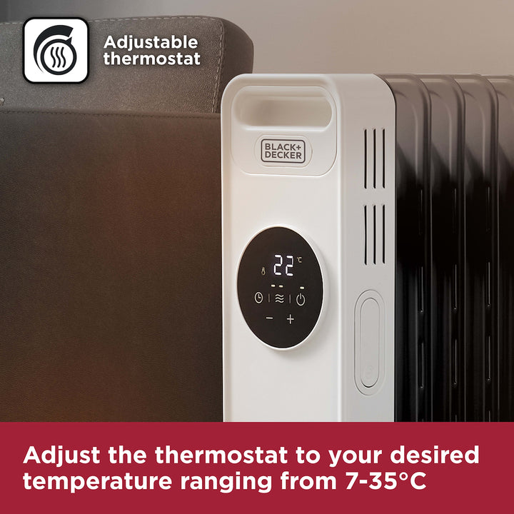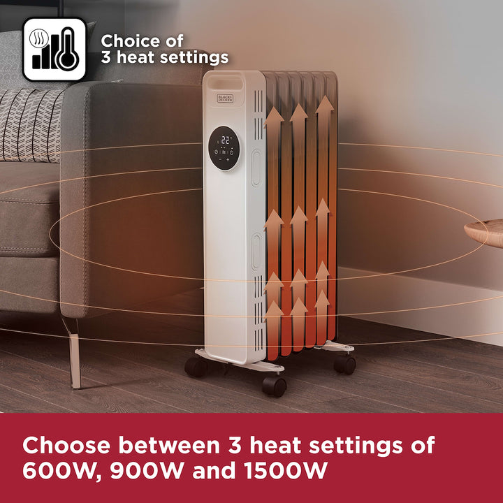 Perfect for cold, winter days, this BLACK+DECKER oil filled radiator is the ideal choice to heat up your home. Offering a choice of three heat settings, 600W, 900W and 1500W, its robust power accompanied with a temperature range of 7 35-degrees, you can create the ideal setting suited to you, granting you flexibility for colder evenings. For convenience, the radiator is fitted with a smart digital display and remote control, you can either adjust the settings manually or from the comfort of your armchair. You can also schedule your heater to come on over a 24-hour period, granting flexible and efficient heating at a time of your choice. With an advanced overheat protection and tip-over switch; the unit will automatically turn off ensuring safety during operation.