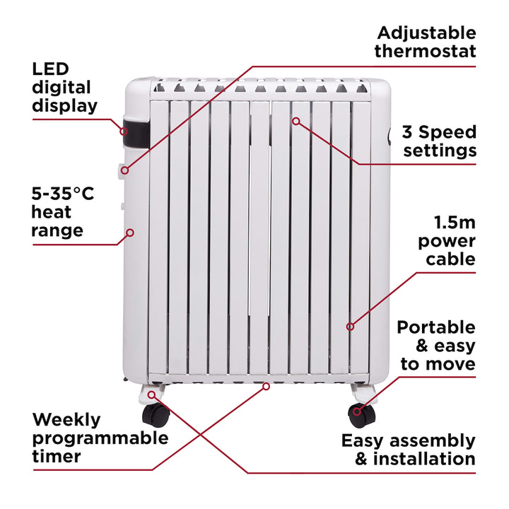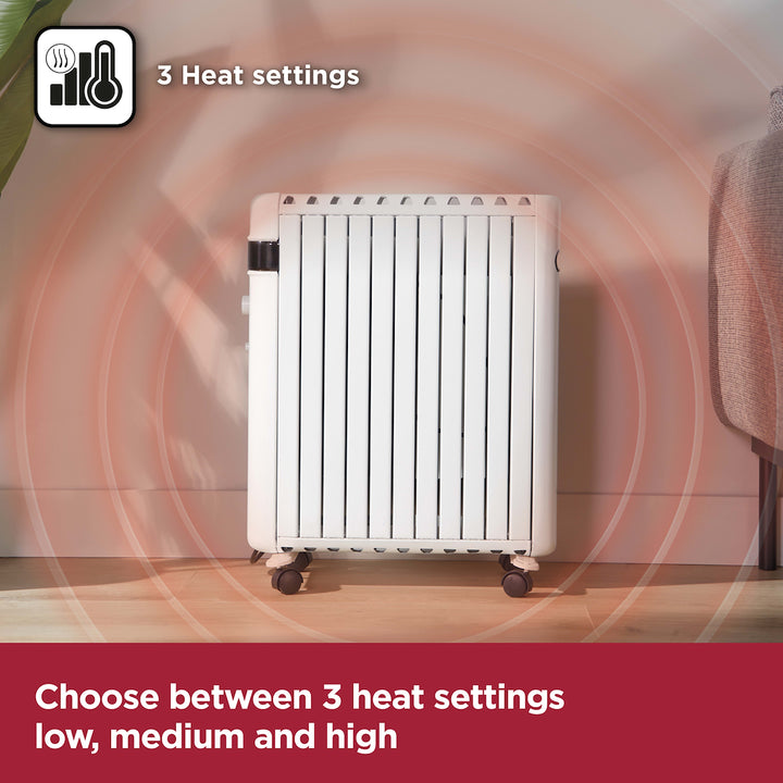 Perfect for cold, winter days, this BLACK+DECKER oil filled radiator is the ideal choice to heat up your home. Offering a choice of three heat settings, 600W, 900W and 1500W, its robust power accompanied with a temperature range of 7 35-degrees, you can create the ideal setting suited to you, granting you flexibility for colder evenings. For convenience, the radiator is fitted with a smart digital display and remote control, you can either adjust the settings manually or from the comfort of your armchair. You can also schedule your heater to come on over a 24-hour period, granting flexible and efficient heating at a time of your choice. With an advanced overheat protection and tip-over switch; the unit will automatically turn off ensuring safety during operation.