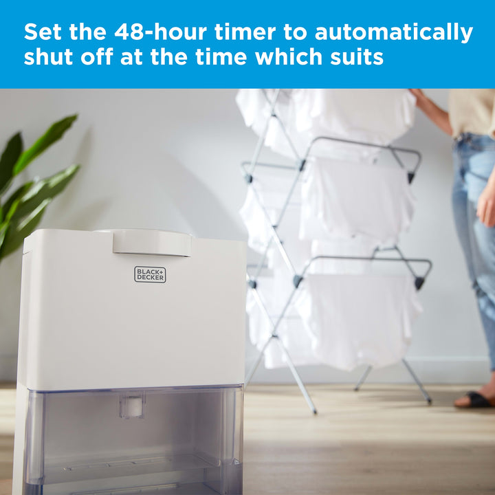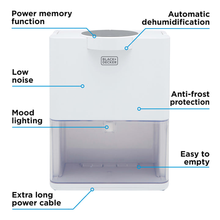 This high-performance dehumidifier from BLACK+DECKER effectively eliminates damp, removes excess moisture in the air and prevents mould forming to promote healthier humidity around the home. The 3.2L water tank is capable of extracting up to 450ml of moisture a day and is easy to empty. Choose between sleep, strong and automatic dehumidification modes for flexible dehumidification. Set your desired humidity level between 40-70% by increments of 5% via the easy-to-use touch panel. The HEPA 11 filter is perfect for removing fine particles, allergens and germs for a healthier and cleaner home. The dehumidifier is energy efficient and consumes a low amount of power, with a 48-hour auto-off timer to save more energy and minimise running costs. When the water tank reaches full capacity, the unit will automatically shut off to prevent leaks and spillages