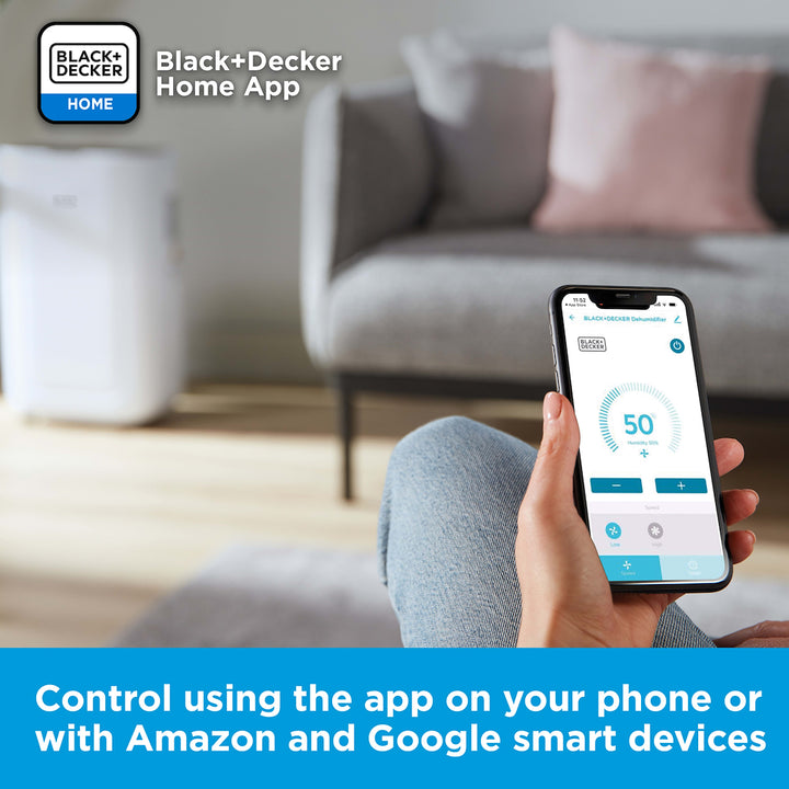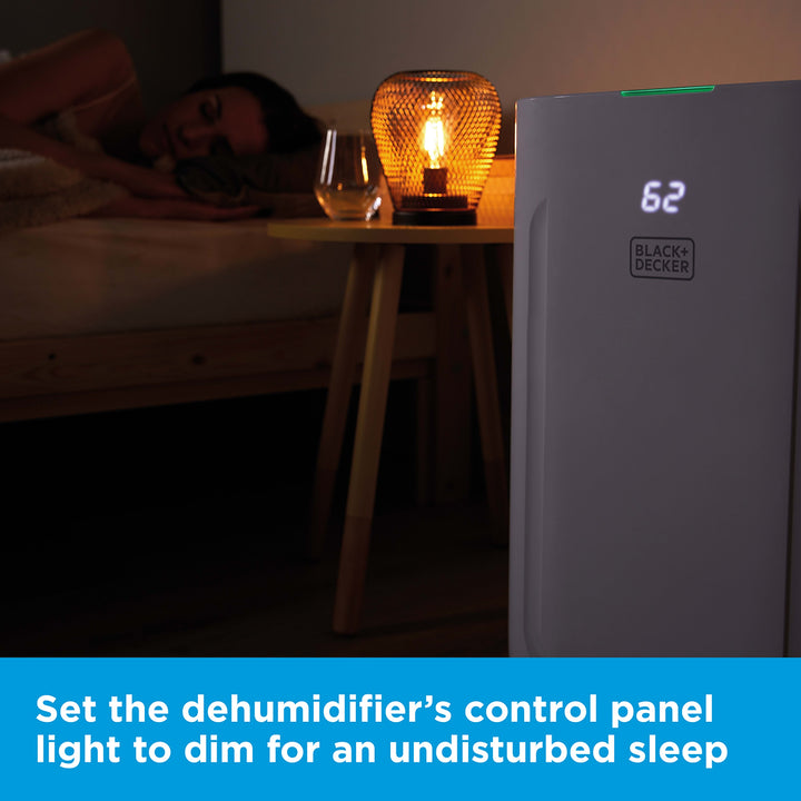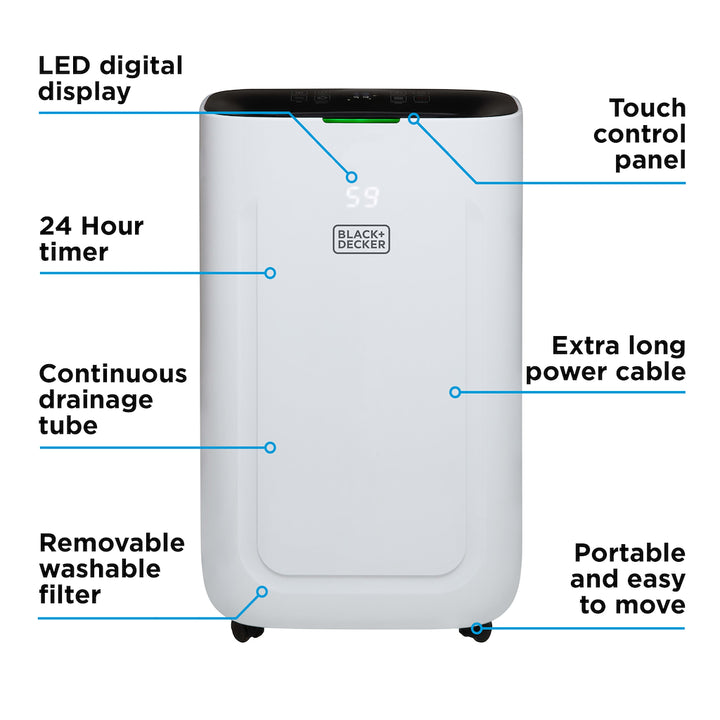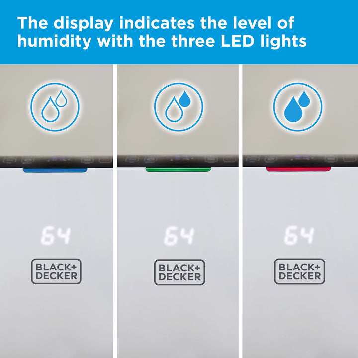 This high-performance dehumidifier from BLACK+DECKER effectively eliminates damp, removes excess moisture in the air and prevents mould forming to promote healthier humidity around the home.The large 6.5L water tank can extract up to 20 litres of moisture a day in temperatures between 5 and 32C, preventing condensation in large rooms around the home or office with excess water and poor air circulation. Choose between 4 function modes to tackle evaporating moisture in the air: protect your home with powerful dehumidifying; set to continuously extract moisture from the environment; dry clothes faster and more effectively; a carbon active filter removes particles and gases for clean air. Set your desired humidity level between 30-80% by increments of 5% via the touch panel. The dehumidifier is energy efficient and consumes a low amount of power, with a 24-hour auto-off timer to save energy and minimise running costs. When the water tank reaches full capacity, the unit shuts off to prevent spillages.