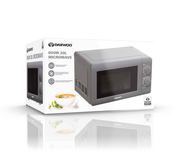 Daewoo 20L Manual Microwave wit 5 Power Settings and 30 Minute Timer, Cooking End Signal and Defrost Function, Cool Grey Housing with Push Button Door and White Interior, 220-240v, 50hz...