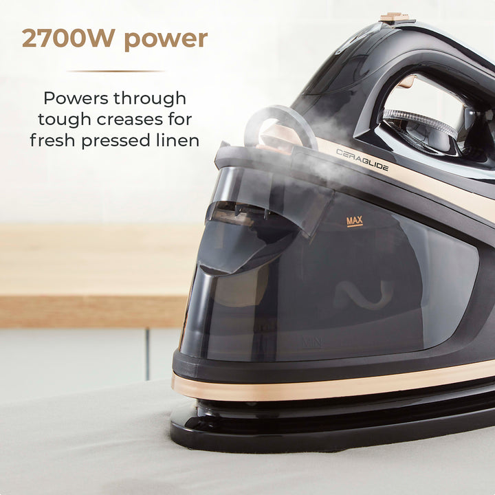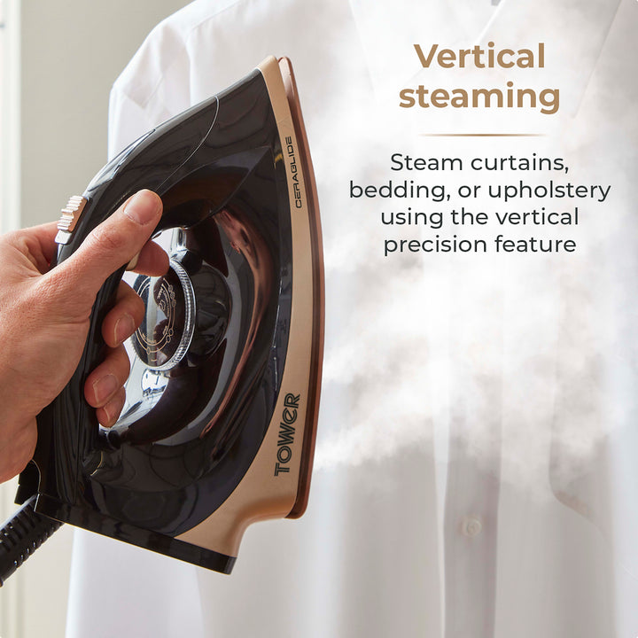 Glide through your ironing pile with the smooth ceramic double soleplate of the Tower Ceraglide 2700W Steam Generator. Heating up in 35 seconds with 80g/min continuous steam and 3 bar pressure steam generator, you can get a head start on your laundry. The ceramic double soleplate ensures the iron glides effortlessly over all types of fabric, so there's no need to worry about snagging any of your clothes. For precision steaming large and small garments, the 80g/min continuous steam output adds to the irons ultimate performance, whilst the 3 bars of steam pressure add moisture to the fabric to make removing creases and crinkles effortless. Taking conventional ironing to the next level, you can target creases in thicker, larger garments such as curtains, bedding and upholstery with the vertical steam setting.
