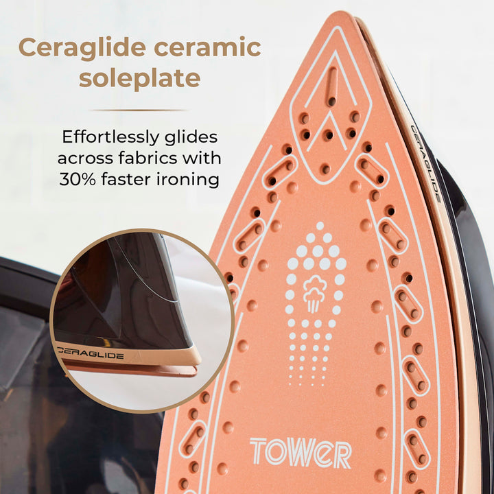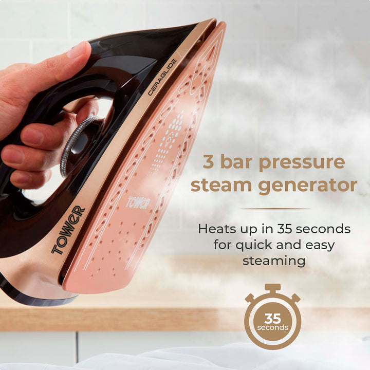 Glide through your ironing pile with the smooth ceramic double soleplate of the Tower Ceraglide 2700W Steam Generator. Heating up in 35 seconds with 80g/min continuous steam and 3 bar...