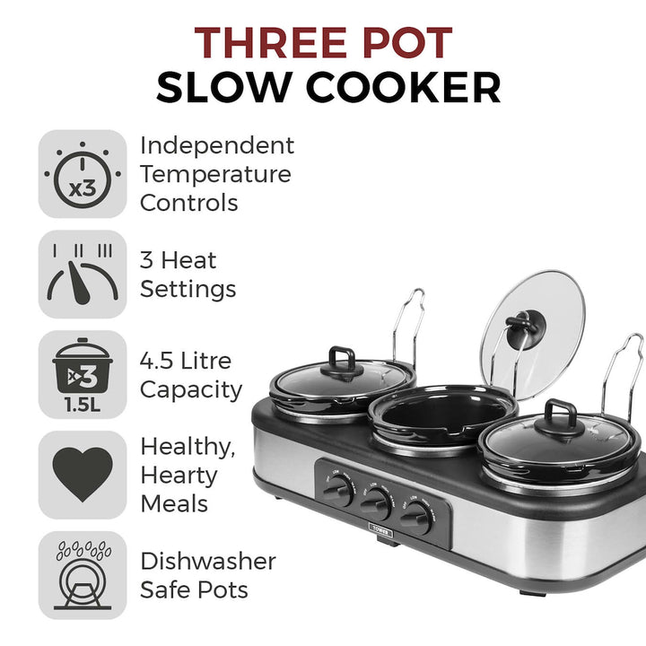 Switch up your mealtimes with the Three Pot Slow Cooker, which includes three separate cooking pots to cook three different dishes at the same time. Ideal for casseroles, curries, chillies and more, the pots feature a combined 4.5 litre capacity so you can create plenty of portions for family and guests. Individual temperature controls with 3 heat settings allow you to effortlessly cook a whole host of meals and includes a handy keep warm function, ensuring food stays warm and ready to serve on your schedule. The tempered glass lids allow ingredients to gently simmer to create dishes full of flavour. Cool touch handles provide added safety when handling the cooking pots. Each lid comes complete with a lid rest for easy, convenient serving, while the dishwasher-safe pots make short work of the clean-up.