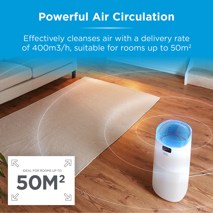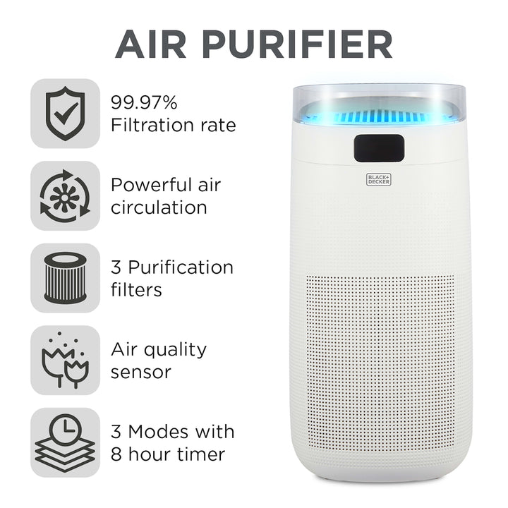 Using a built-in HEPA13 filter, this air purifier is able to remove up to 99.97% of fine particles trapped in the air, eliminating allergens and bacteria to create healthy airflow around your home. Its powerful air purification technology can cleanse air in large rooms up to 50m2, capturing dust and pet hair with a pre-filter to improve your allergies all year round. It features an anti-bacteria filter to trap harmful particles, in addition to a UV light to kill bacteria and germs. Its carbon filter helps cleanse unpleasant odours to refresh your room's scent. Select from sleep, high or automatic air purification modes for effective cleansing based on your air quality, indicated by 3 LED lights which display the current amount of air pollution in the room. An 8-hour timer can be set to automatically shut down the device at a specified time to save energy.