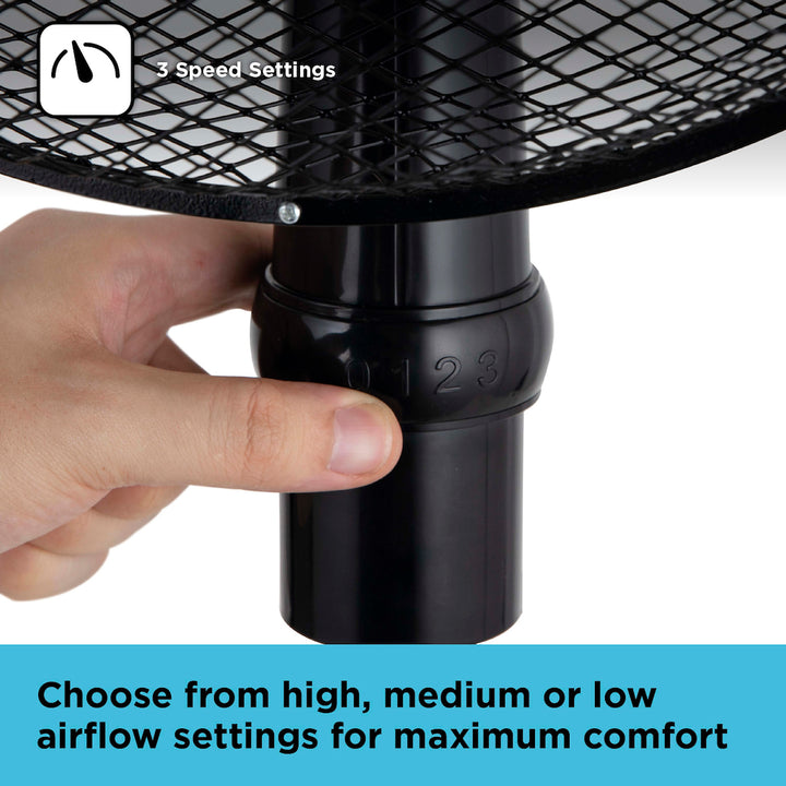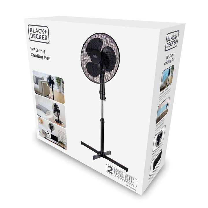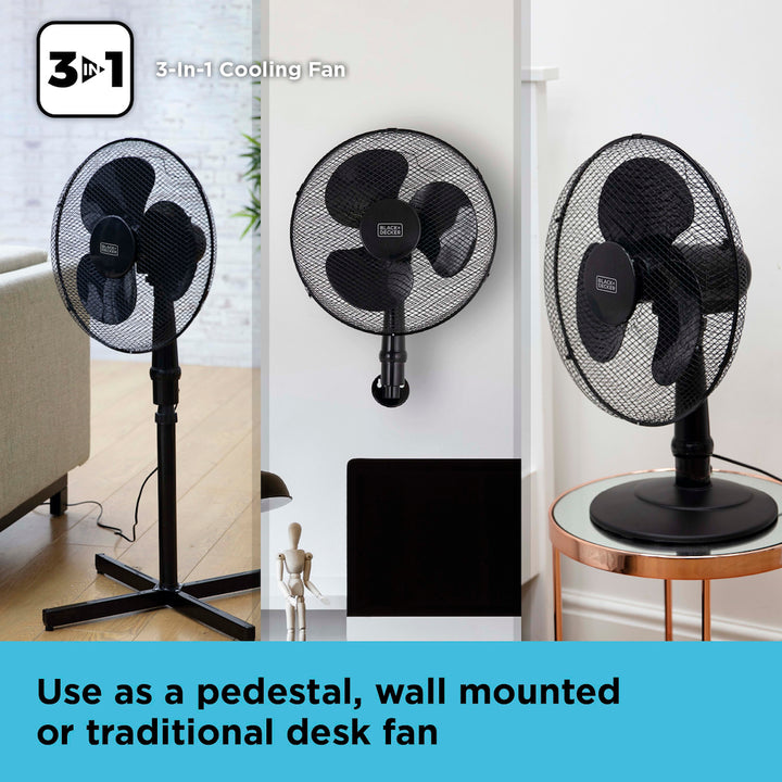 Quickly cool yourself down with the rapid cooling effect of this 3-in-1 cooling fan. The durable copper motor provides a high quality performance to help cool your home or office. Its versatile design can be turned into a pedestal fan, desk fan, or mounted on the wall to save on floor space for added versatility. The fan features an adjustable height and tilt function, while the rotating central dial on the pole offers the choice of 3 speed settings for a low, medium or high speed airflow for maximum comfort. The rotary oscillation provides air coverage across a 75- degree angle to help keep you and the surrounding area cool. The anti-slip rubber feet provide extra stability on the floor or work surface. The fan is easy to assemble.