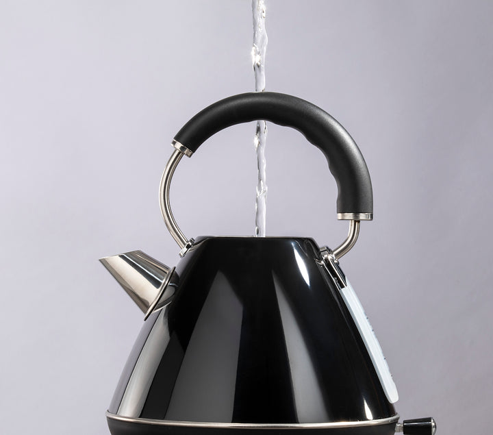 Daewoo Kensington Pyramid 1.7L Capacity Stainless Steel Kettle (3000W Power) with Cordless Rotational Base and Concealed Heating Element, Space Saving Cord Storage and LED Indicator- Black