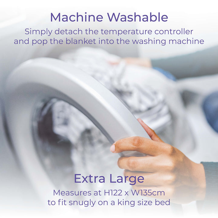 Enjoy extra warmth and cosiness all night long with the Carmen King Size Heated Under Blanket made from 450gsm polyester soft to touch fabric. With a powerful 70W output and choice of 3 different heat settings, the blanket heats up to your perfect temperature in no time for a comfortable night's sleep. The blanket is efficiently designed to allow consistent warmth as you sleep, costing just 14p per night to run. For a quick and easy clean, simply detach the temperature controller and pop the blanket into the washing machine. The blanket automatically switches off to avoid overheating and provides added safety, so you can operate it safely during the day and night. Measures at H122 x W135cm to fit snugly on a king size bed, so you can wrap yourself up warm and stay cosy all night long.