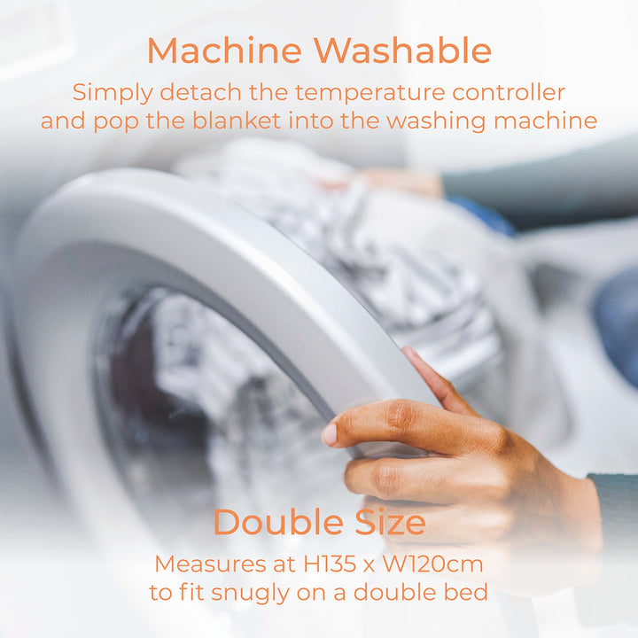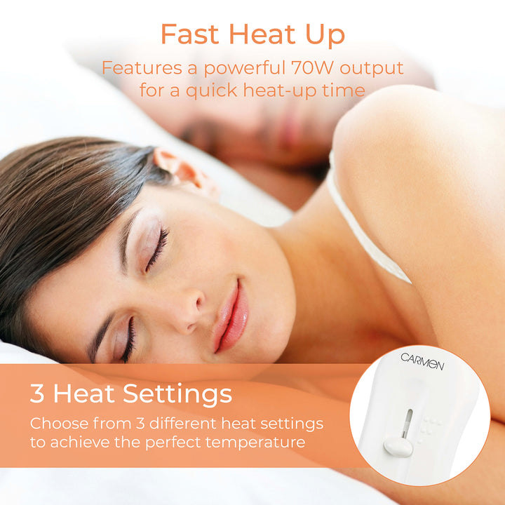 Enjoy extra warmth and cosiness all night long with the Carmen Full Size Double Heated Under Blanket made from 450gsm polyester soft to touch fabric. With a powerful 70W output and choice of 3 different heat settings, the blanket heats up to your perfect temperature in no time for a comfortable night's sleep. The blanket is efficiently designed to allow consistent warmth as you sleep, costing as little as 14p per night to run. For a quick and easy clean, simply detach the temperature controller and pop the blanket into the washing machine. The blanket automatically switches off to avoid overheating and provides added safety, so you can operate it safely during the day and night. The blanket is even compatible with memory foam mattresses for great versatility. Measures at H135 x W120cm to fit snugly on a double bed, so you can wrap yourself up warm and stay cosy all night long.