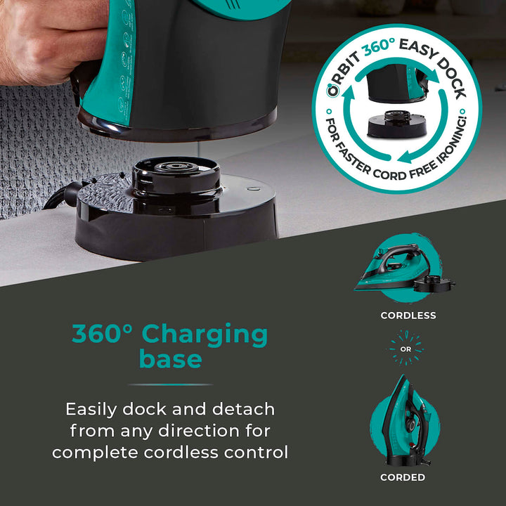 Glide through your ironing pile without fuss using this Ceraglide 360 Cord Cordless Steam Iron. It can be easily docked to the 360 charging base and detached from any direction, giving you the complete convenience of cordless ironing at your fingertips. Powerful steam output lets you tackle stubborn creases in your clothes with an effortless glide. Youll fly through your ironing pile in record time with its rapid 25-second heat-up and super-fast 10-second recharge time. A tapered precision tip makes it easier to iron around awkward buttons, fastening and hard-to-reach edges. Anti-calc and self-cleaning functions prolong its reliable performance and protect your clothes against scale. The vertical steam setting makes short work of hanging garments, curtains and upholstery, complete with variable temperature control and ceramic soleplate for a smooth glide across all fabric types.