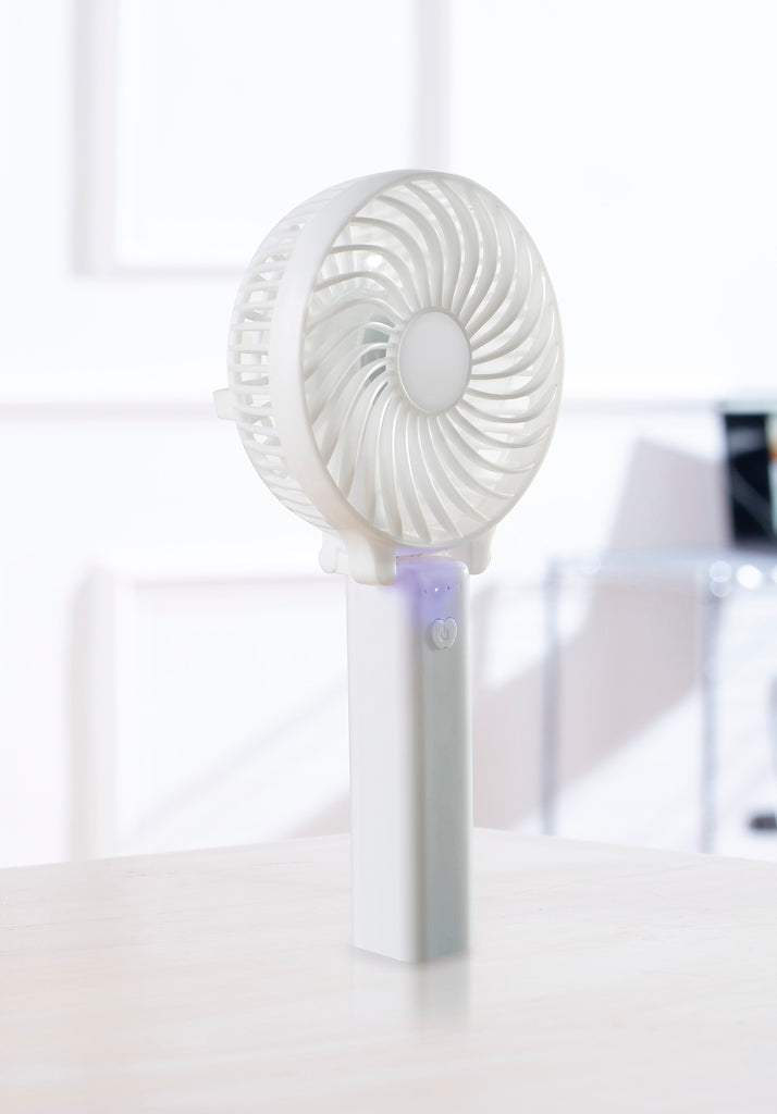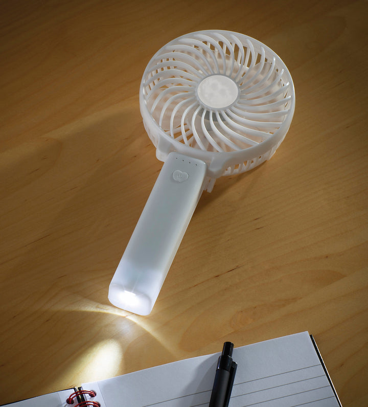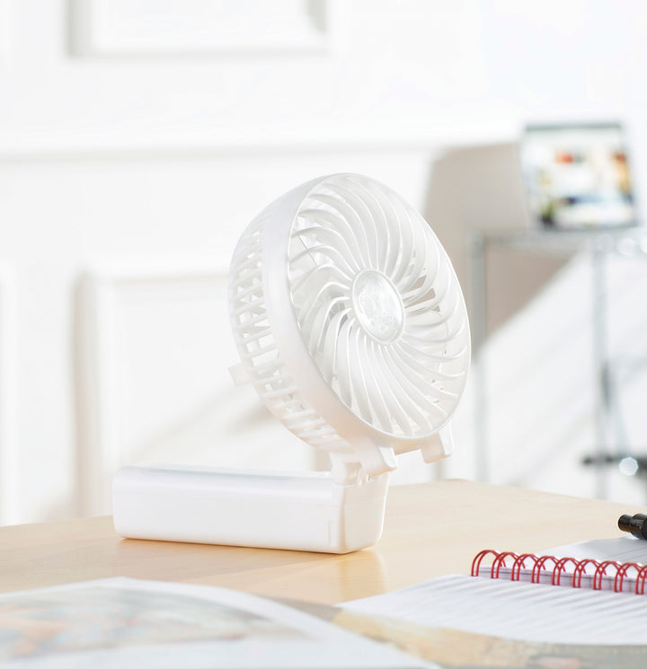 USB rechargeable, compact and folding fan. It folds cleverly to become a desk fan and a mini torch. Includes battery and charging cable.