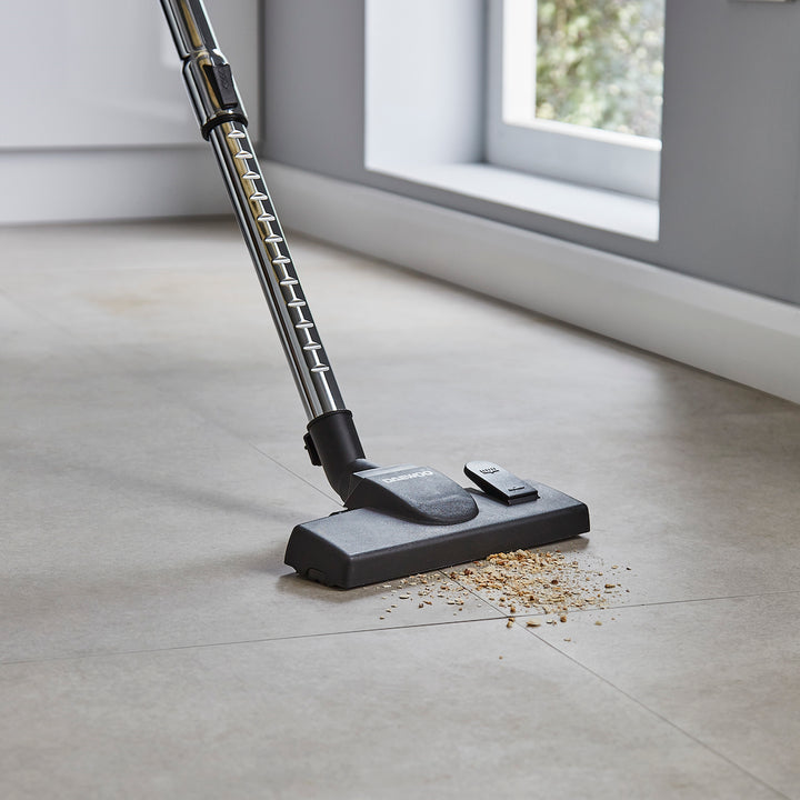 The 'Daewoo Tornado Bagged' vacuum cleaner has a powerful 700W motor with a transition foot toggle switch for optimal performance on carpets and hard floors. It is lightweight and easy to move with a 5m auto recoil cable, 2m flexible hose, and 1m telescopic tube, providing an 8m surface cleaning reach. The vacuum cleaner includes a 2L disposable cloth dust bag and a 2-in-1 crevice and brush tool for cleaning hard-to-reach areas.