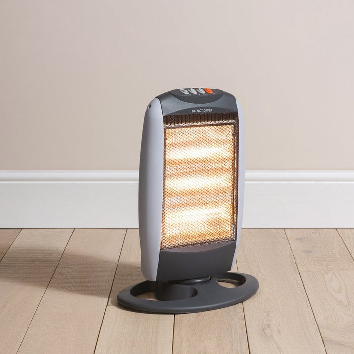 Introducing the 1200W Halogen Heater, ideal for medium-sized rooms. With instant heat and three heat settings (400W/800W/1200W), it ensures comfort. For added safety, it features a tip-over cut-out, and its oscillating function spreads warmth evenly.