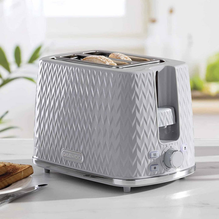 Daewoo Argyle 2 Slice Patterned Toaster | Reheat, Defrost & Cancel Controls | Electronic Browning Feature | Removable Crumb Tray | Anti-Jam Function | Self-Centering | 220-240V/50-60Hz/780-930W - Grey