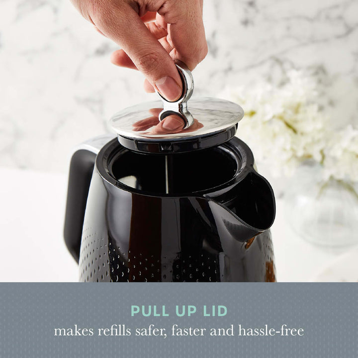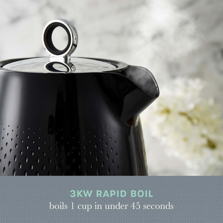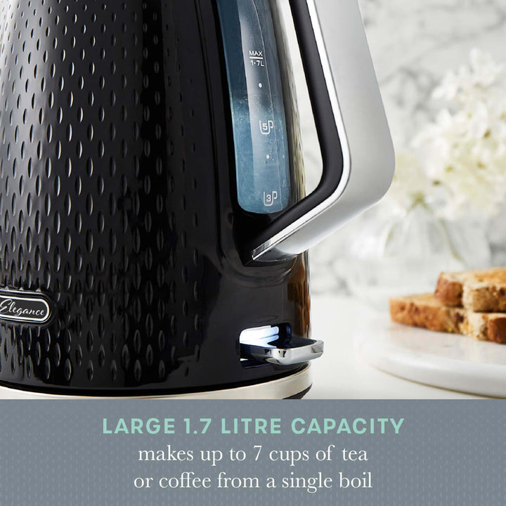 Nothing beats that first cup of coffee in the morning or winding down with a brew after a long day. This black kettle from the new Swan Elegance collection features a premium textured gloss finish to add style to your worktop. The cordless kettle features a large 1.7 litre capacity to make 7 cups on one boil, so you can entertain friends and family with hot chocolates, coffees and teas. Fancy a brew before your next meeting? The 3KW of power rapidly boils water for one cup in under 45 seconds. This Swan SK14016BLK Elegance electric kettle has been designed for convenience thanks to the pull up lid, providing a safe and hassle-free way to refill. Boil dry protection keeps your kettle from over boiling if there isn't enough water, helping avoid damage. After boiling, the kettle switches off automatically for extra safety in family homes. Creating a nice warm drink has never been easier. The Swan Elegance collection's distinctive design is the perfect addition if you are looking to freshen up your kitchen decor.