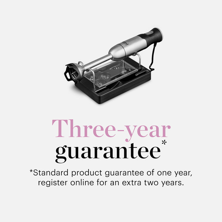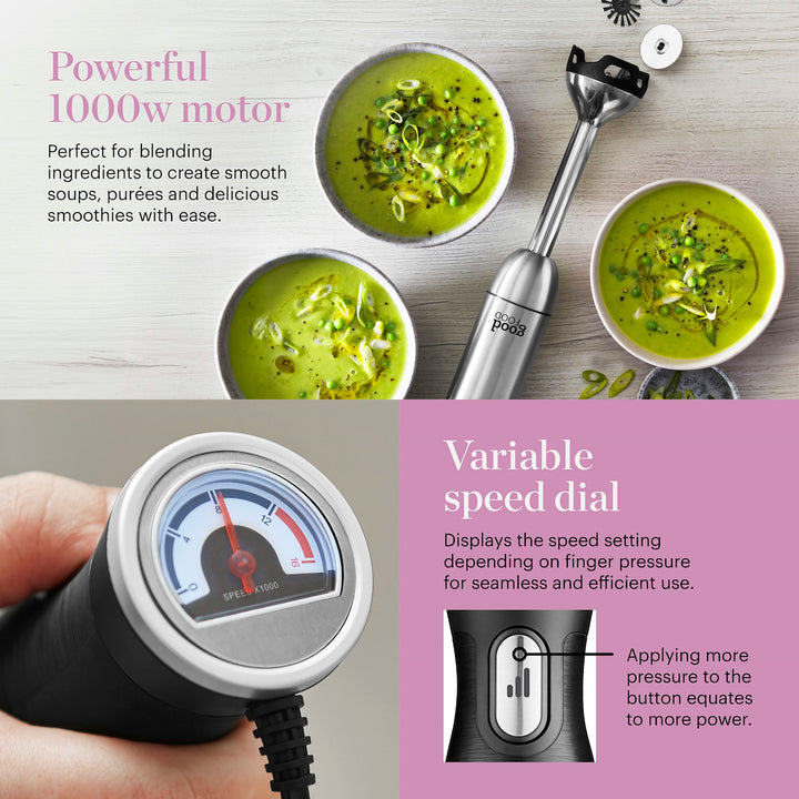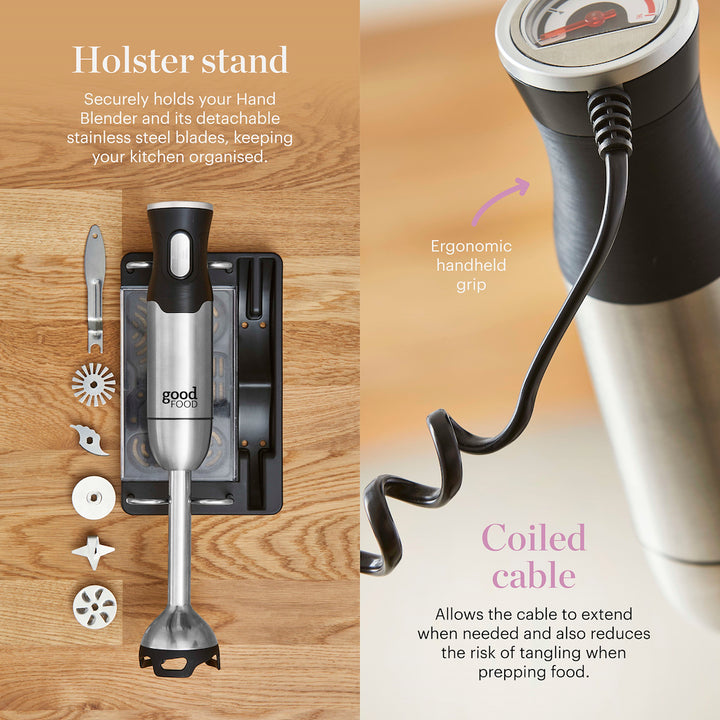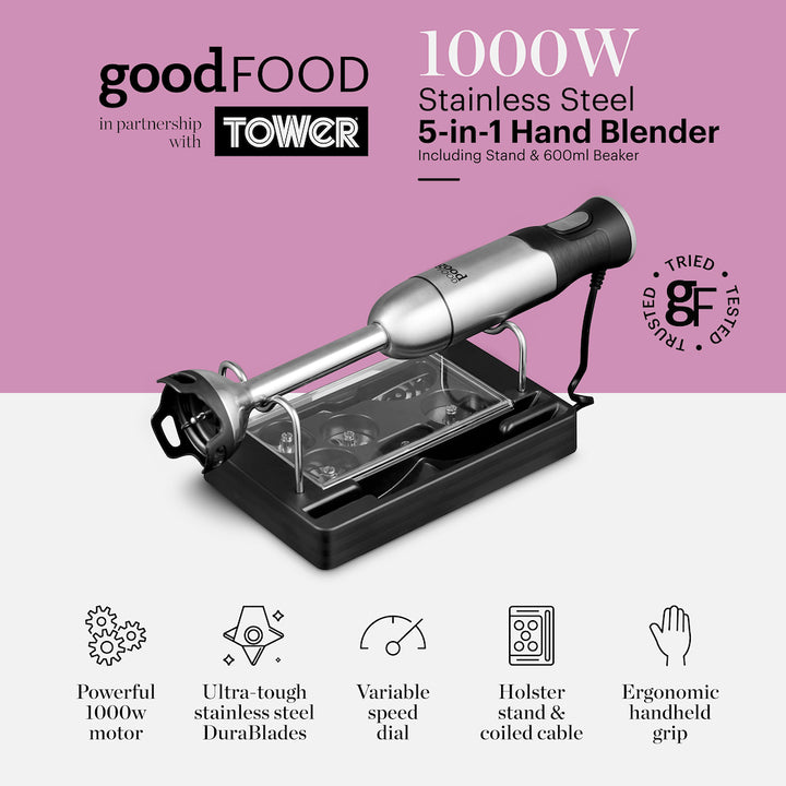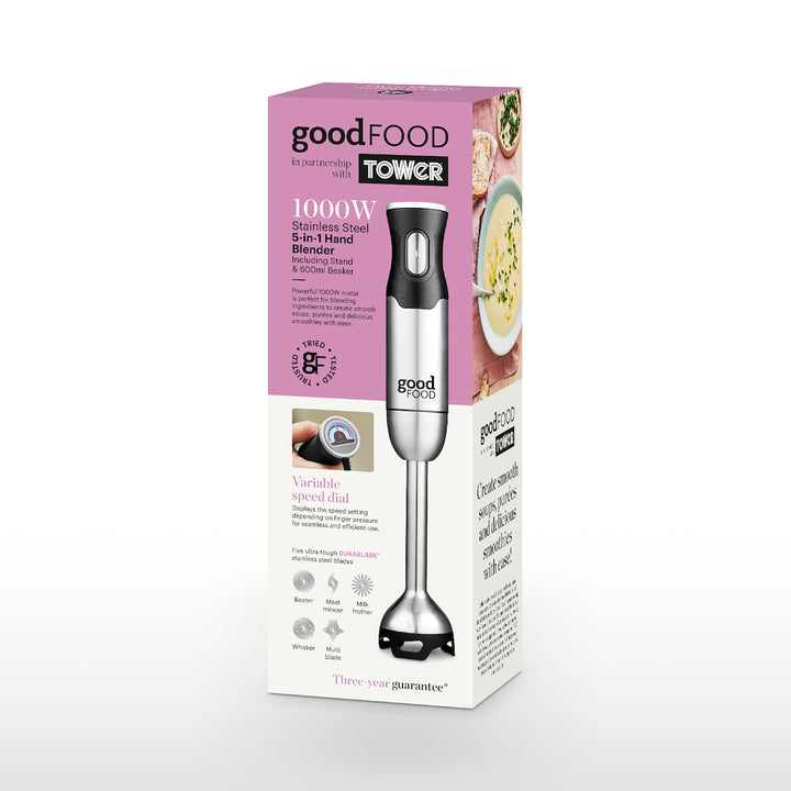 This powerful Digital Hand Blender from Good Food by Tower is perfect for creating delicious soups, smooth batters and thick sauces for the whole family to enjoy. Complete with 5 interchangeable blades, the multi-functional design helps to bring versatility to mealtimes. The 1000W DC motor is powerful enough to help blend mixtures with ease, whilst stainless steel blades effortlessly slice through ingredients seamless and efficient use. Choose from milk frother, meat mincer, whisker, multi-blade and beater attachments, whilst the variable speed dial will let you control the speed settings with one hand so you can save time in the kitchen. It comes with a 600ml beaker so mixtures can be served and stored for later, along with an accessory holder for simple and convenient storage. The ergonomic grip ensures the blender sits comfortably in your hand, offering comfort and manoeuvrability when in use, whilst there is greater freedom of movement with a curly cord that prevents you from getting tangled