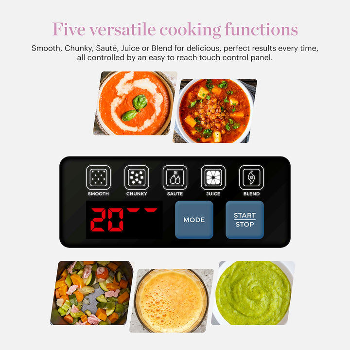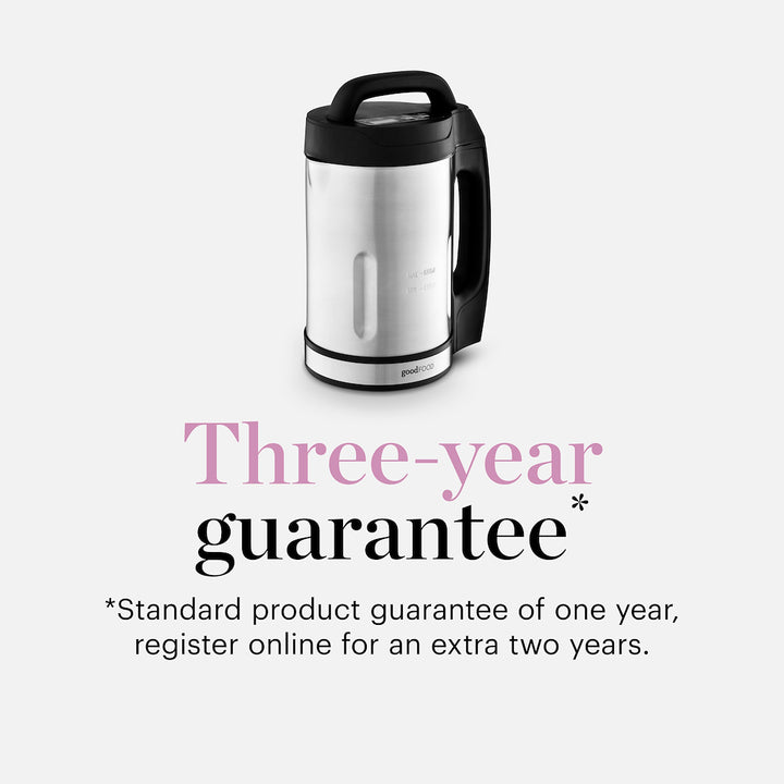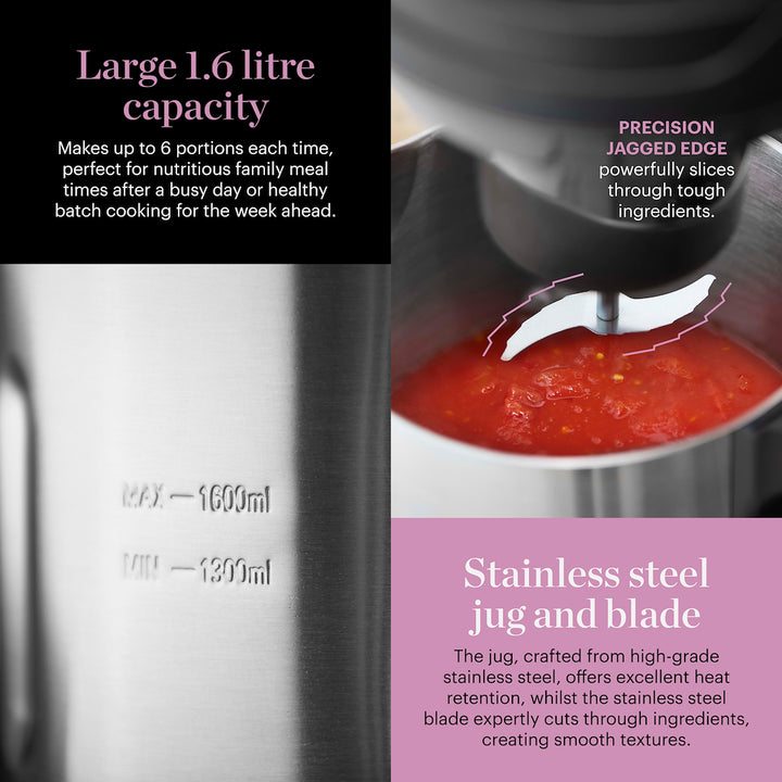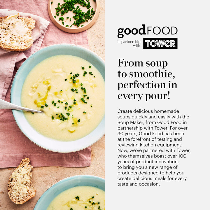 Create delicious smooth soups, refreshing juices and silky broths with this 1.6L Soup Maker from Good Food in partnership with Tower. Featuring a spacious 1.6L capacity, you can create large batches for the whole family or prepare extra portions for the week ahead. Crafted from high quality stainless steel, the jug offers heat distribution for thorough and efficient cooking, whilst the non-stick interior prevents food from sticking for simple cleaning. The stainless steel blade effortlessly slices through ingredients to create smooth textures, allowing you to create dishes with the ideal consistency. Smooth, Chunky, Saut, Juice Blend options provide complete versatility so you can easily create hearty family meals in one jug with no additional pans required. The soup maker can cook deliciously hot meals in under 30 minutes for convenience, whilst the LED control panel offers a customisable cooking experience, allowing you to cycle through functions with ease to save time and effort in the kitchen.