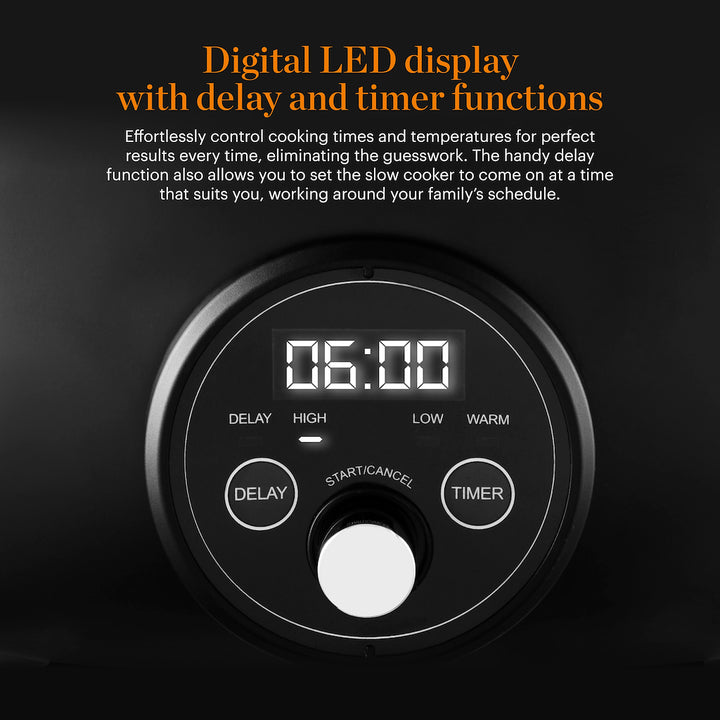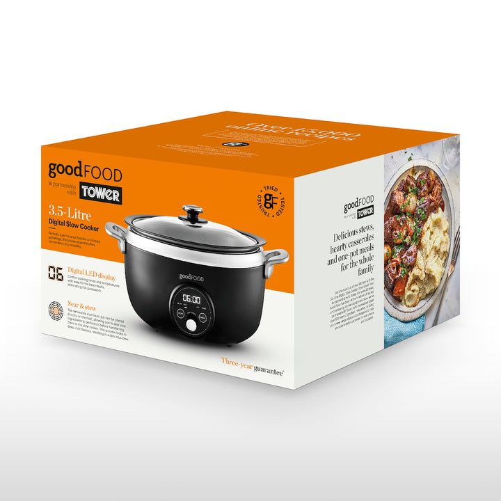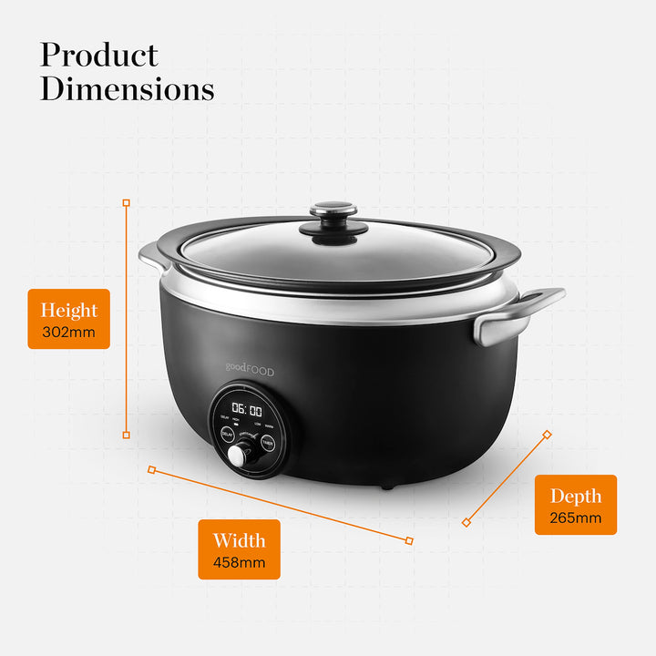 Get the most out of your kitchen with this 6.5L Slow Cooker from Good Food. Specially designed to be used with the vast Good Food recipe library, it is perfect for budding chefs who want to test their skills and creating family sized portions. The removable aluminium pot allows for easy serving and lets you brown off food on the hob prior to cooking to create more flavoursome meals. You can create full family meals thanks to the 6.5L capacity, whilst the tempered glass lid helps to lock in moisture and nutrients for meals that are packed full of flavour, whilst you can also monitor the cooking process without having to take off the lid. Cool touch handles provide added safety, whilst the LED Digital display makes it simple to cycle through the high, low and keep warm functions for seamless and efficient use.