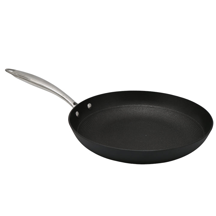The Hairy Bikers 28cm Fry Pan combines innovative design and functionality for a superior cooking experience. Crafted with a light-weight cast iron construction, it offers the durability of cast iron without the bulk. The pan features a cast polished stainless steel handle for comfortable and secure grip, ensuring ease of use. With two layers of non-stick coating, it promotes easy food release and effortless cleaning. The specially designed honeycomb base enhances heat distribution, making it suitable for all hob types. This fry pan is a versatile addition to your kitchen, providing the benefits of cast iron cooking in a lightweight and user-friendly package.