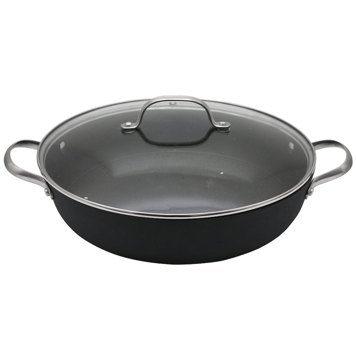 The Hairy Bikers 30cm Casserole combines innovative design and functionality for a superior cooking experience. Crafted with a light-weight cast iron construction, it offers the durability of cast iron without the bulk. The pan features a cast polished stainless steel handle for comfortable and secure grip, ensuring ease of use. With two layers of non-stick coating, it promotes easy food release and effortless cleaning. The specially designed honeycomb base enhances heat distribution, making it suitable for all hob types. This fry pan is a versatile addition to your kitchen, providing the benefits of cast iron cooking in a lightweight and user-friendly package.