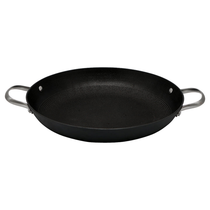Introducing our Bikers Lightweight Cast Iron 32cm Paella Pan. Constructed with lightweight cast iron, it features two layers of non-stick coating, a cast polished stainless steel handle, and a specially designed honeycomb base.