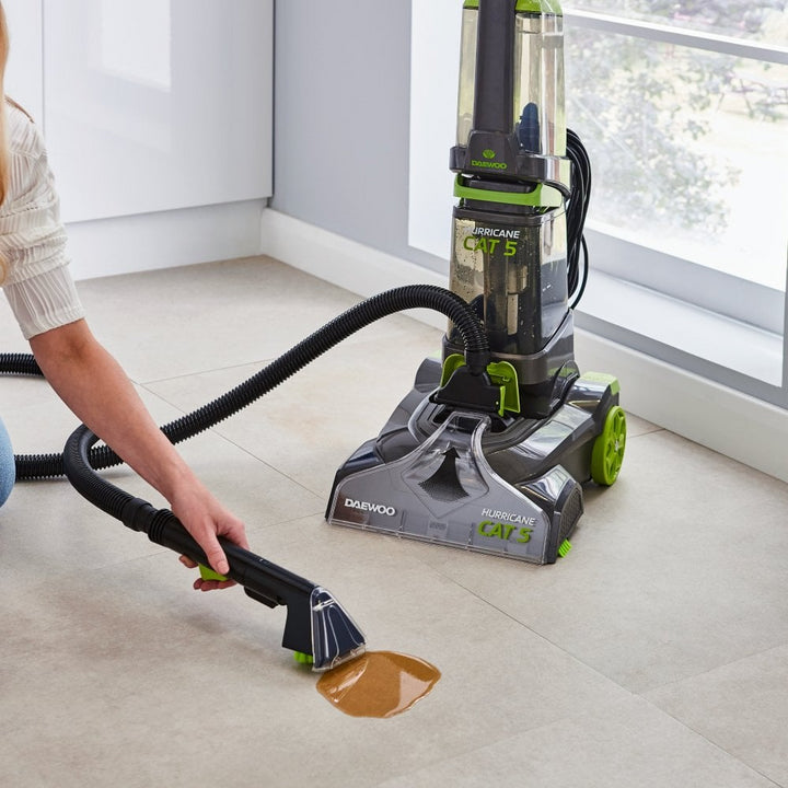The Daewoo Hurricane Cat 5Carpet Washer is corded and upright with an easy-empty 1.6L clean water tank and a 2.1L dirty water tank. The carpet cleaner comes with an 8m...