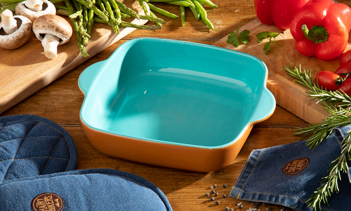 Introducing our Hairy Bikers Large Stoneware Square Baking Dish. It features durable stoneware construction with a terracotta exterior and blue internal glaze. With durable handles for easy use and a sealed terracotta exterior finish, this baking dish is both functional and stylish.