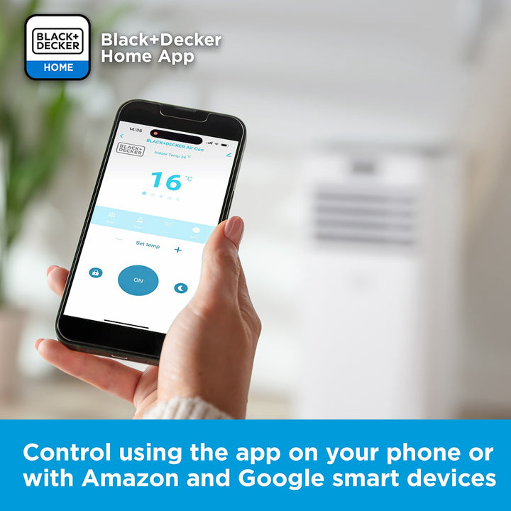 This versatile air conditioner has 3 operating modes providing high-performance air conditioning, dehumidifying cooling for large rooms up to 28m2 for a comfortable, healthy home. A powerful 7,000 BTU output provides Class A energy efficiency for low environmental impact optimum performance at low cost. Smart functionality lets you control the unit via the BLACK+DECKER Home App from anywhere to adjust temperature, modes set weekly schedules. Powerful 2kW cooling offers high low wind speeds to deliver a strong, cool breeze for comfort. High performance technology removes excess moisture to prevent damp, mould mildew from forming in rooms, closets wardrobes. The dehumidifying function extracts up to 19L of unwanted moisture per day continuously via the drainage hose. Set the 24 hour timer with the soft-touch control panel or the remote control to schedule shut-off or start-up at preferred times. Sleep mode turns off the air conditioner once optimum room temperature is reached, dimming the display.
