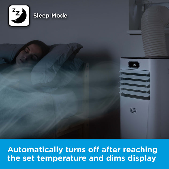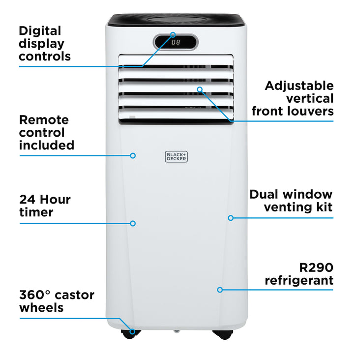 This versatile air conditioner has 3 operating modes providing high-performance air conditioning, dehumidifying cooling for large rooms up to 37m2 for a comfortable, healthy home. A powerful 9,000 BTU output provides Class A energy efficiency for low environmental impact optimum performance at low cost. Smart functionality lets you control the unit via the BLACK+DECKER Home App from anywhere to adjust temperature, modes set weekly schedules. Powerful 2.6KW cooling offers high low wind speeds to deliver a strong, cool breeze for comfort. High performance technology removes excess moisture to prevent damp, mould mildew from forming in rooms, closets wardrobes. The dehumidifying function extracts up to 21L of unwanted moisture per day continuously via the drainage hose. Set the 24 hour timer with the soft-touch control panel or the remote control to schedule shut-off or start-up at preferred times. Sleep mode turns off the air conditioner once optimum room temperature is reached, dimming the display.