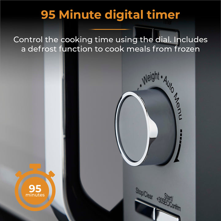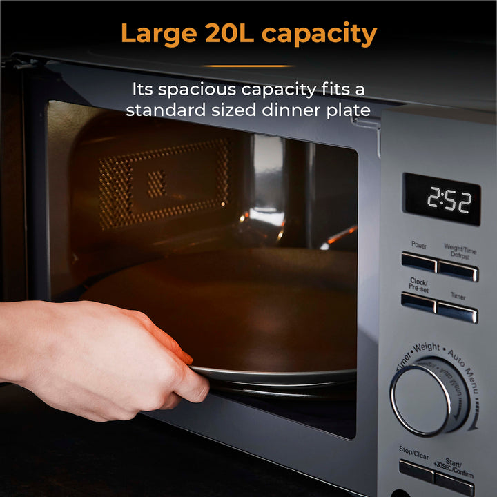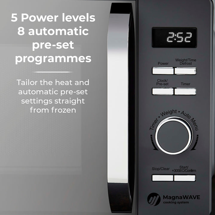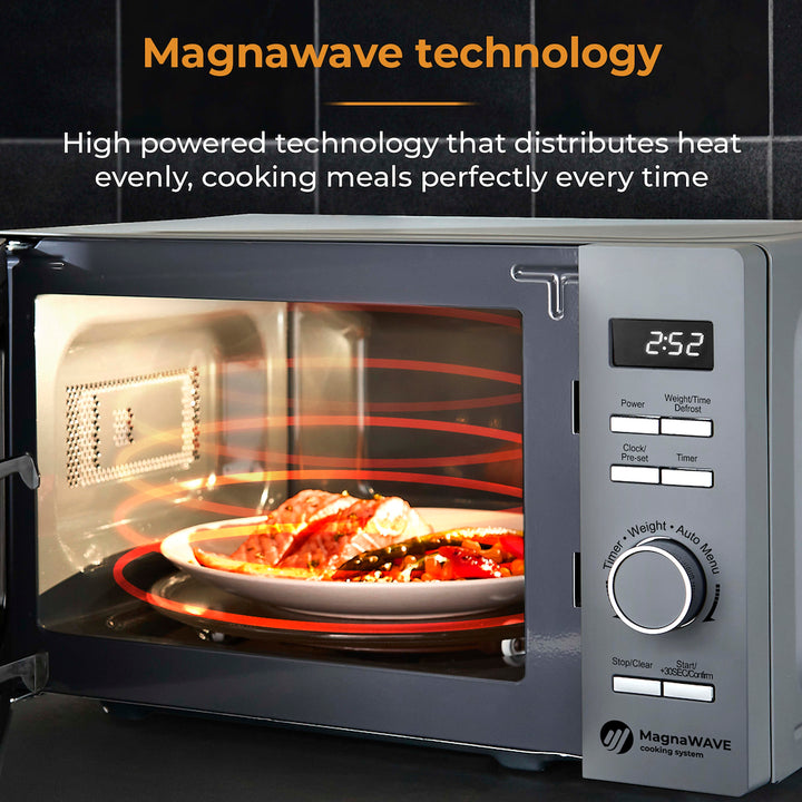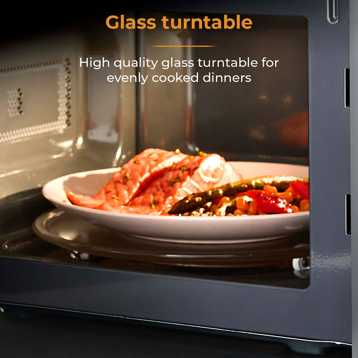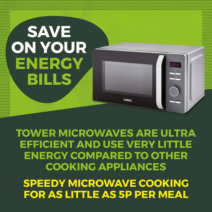 Enjoy straight-forward, no-nonsense cooking using Towers Renaissance microwave. Powered by intuitive Magnawave technology, heat is evenly distributed ensuring meals are cooked consistently. Conveniently adjust the 5 power settings with a maximum output of 800W to suit the specific cooking job, whether thats warming up a quick meal, thawing frozen meats or softening ice cream. The handy 8 pre-set programmes ensure you get the best results when heating your meals, simply select the chosen pre-set specific to your meal including a defrost function cook emergency snacks and meals straight from frozen. Its easy to fit a standard sized dinner plate inside with the spacious 20 litre capacity. The glass turntable rotates the food in a circular motion inside the microwave to ensure there are no cold spots.