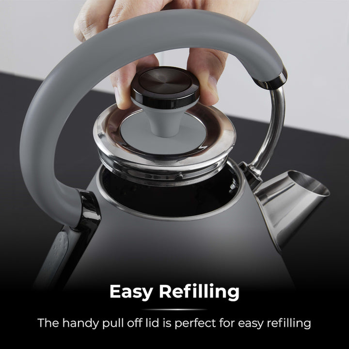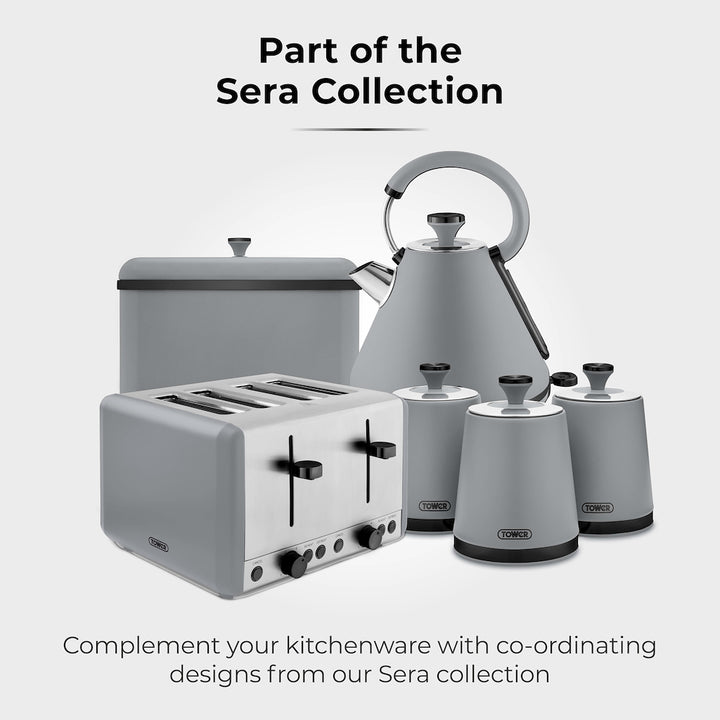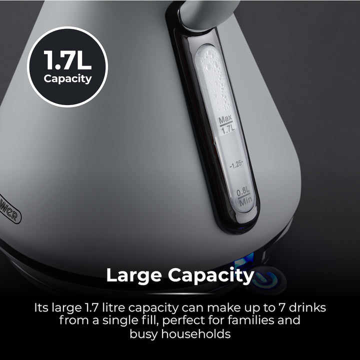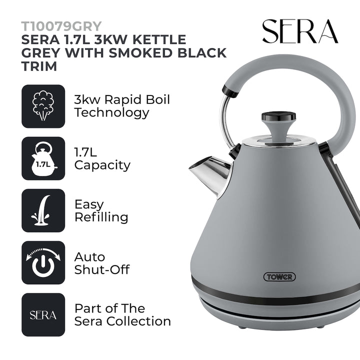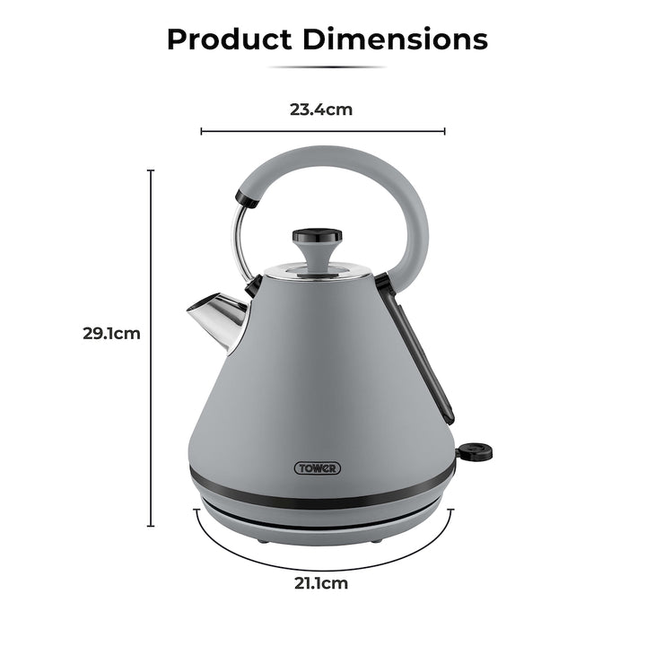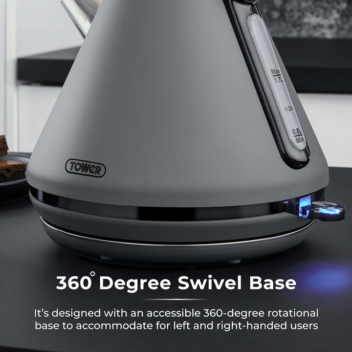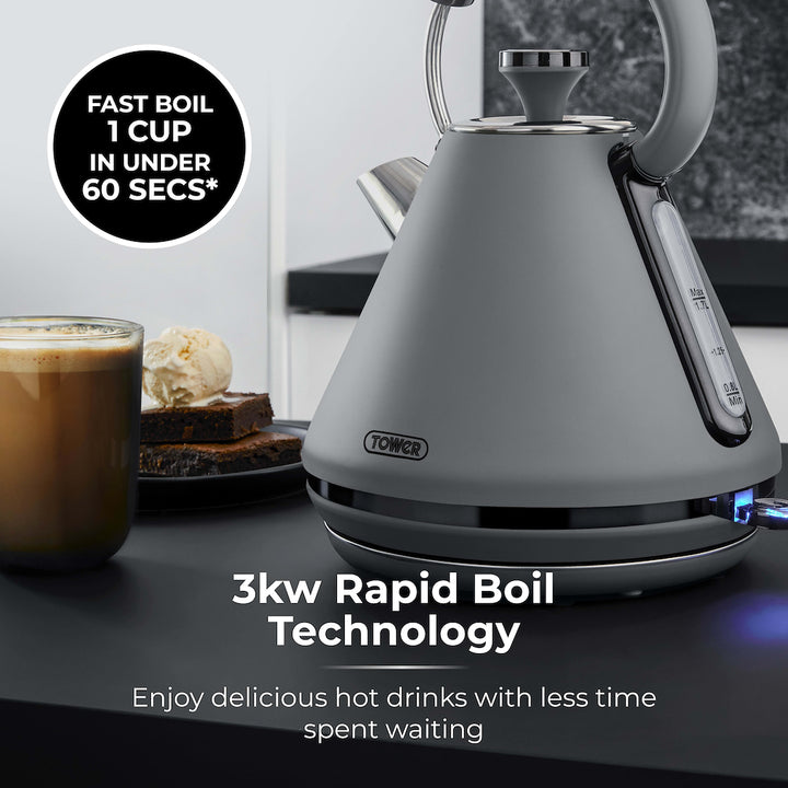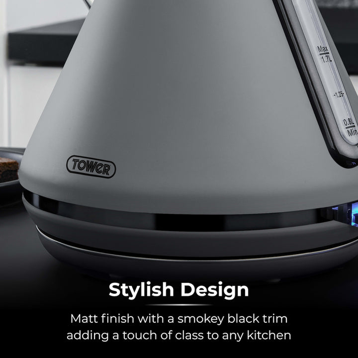 Add contemporary style to your kitchen with this elegant Sera Pyramid Kettle from Tower. It features a matte grey finish with a smoked black trim, making it an eye=catching addition to any countertop. Full of modern functionality, it's powered by rapid boil technology to reduce your wait for a delicious hot drink, boiling 1 cup in less than 60 seconds. A large 1.7L capacity lets you make up to 7 drinks from a single fill, ideal for families and busy households alike. With a detachable filter, you can easily remove and rinse away limescale to keep your coffee and tea tasting its best. The perfect pour spout protects against boiling hot water spillages, while the 360-degree swivel base and fully removable lid make it simple to lift and refill the kettle no matter whether you're left or right-handed.