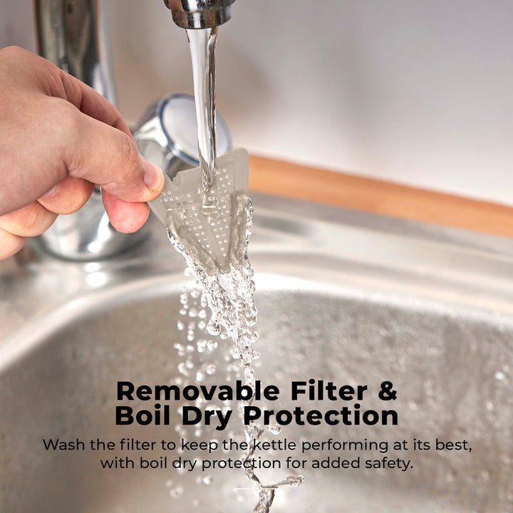 Enjoy the perfect morning brew without the faff with Tower's modern design Solitaire kettle. Featuring impressive rapid boil technology, the kettle boils a cup of water in just under a minute, quenching your caffeine needs quickly. Its 1.5L capacity allows you to brew up to 6 cups from a single fill, making it perfect for entertaining family and friends, while suitable for both left and right handed users due to its 360 swivel base. Using the flip-top lid, you can easily fill up the kettle with water when you need to after checking the water level using the water level indicator window and its perfect pour spout prevents any spillages. To keep the kettle performing at its best, it comes complete with a removable and washable filter and boil dry protection, automatically switching the heating element off if there's no water inside.