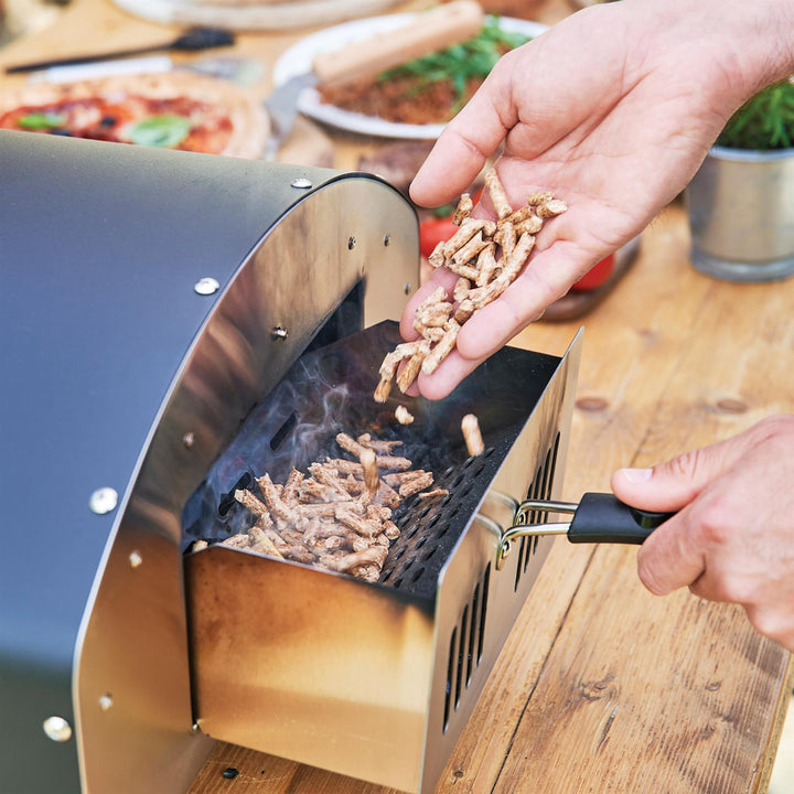 Take garden parties and BBQs to the next level with Statesman’s 13 Inch Wood Fired Pizza Oven. Its wood pellet fuel system ensures even, fast cooking as well as producing authentic, smoky flavours, and with a top temperature of 470°C, you’ll be able to rustle up delicious, stone-baked pizzas in as little as 3 minutes. Not just for pizzas, this versatile appliance is also perfect for cooking succulent steaks, fresh fish, juicy vegetables and even bread in no time.This pizza oven’s dual-layered housing is designed for optimum heat retention and distribution across the 13-inch ceramic pizza stone, meaning food will be cooked evenly every time. Perfect for outdoor entertaining, this pizza oven is a great centrepiece for any garden. The waterproof storage cover will protect the appliance against the elements and keep it looking its best whilst not in use.