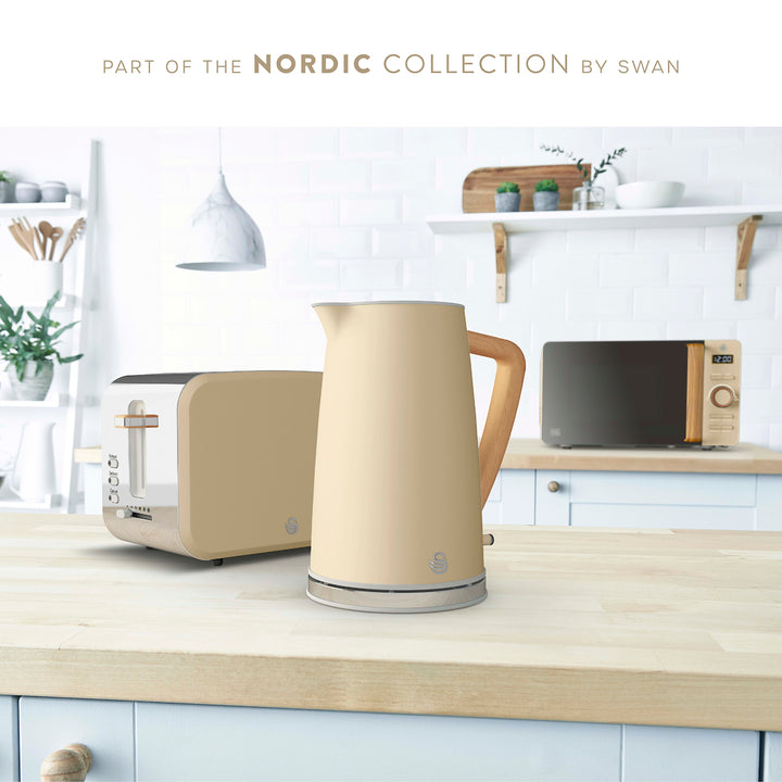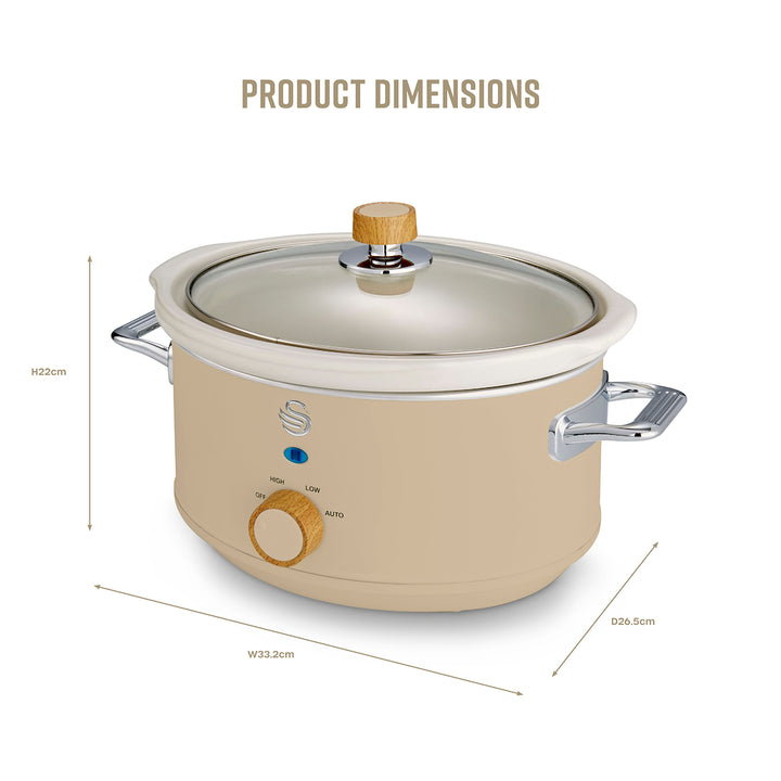 Cook delicious, hassle-free hearty meals with this Swan SF17021OAT Nordic oatmeal 3.5 litre slow cooker. From casseroles to chilli con carne, make a range of dishes for all the family. There are three heat settings - low and high to thoroughly cook your food for a rich and full flavour, ready for when you get home - along with an auto keep warm function so food stays at a consistent temperature if you want to go back for seconds. The sturdy glass lid lets you safely monitor your food, while sealing in the warmth to retain heat for fast and efficient cooking. The inner ceramic pot is removable, allowing you to serve food at the dinner table and it's dishwasher safe for easy cleaning. It's compact and can be stored away in your cupboard or left on the worktop if you use it regularly. Non-slip feet provide stability and prevent scratching your surface. The Swan Nordic collection is inspired by Scandinavian minimalist design, featuring neutral colour schemes and wood-effect accents to compliment any home decor.