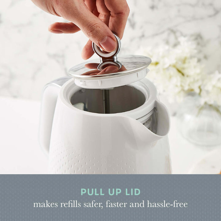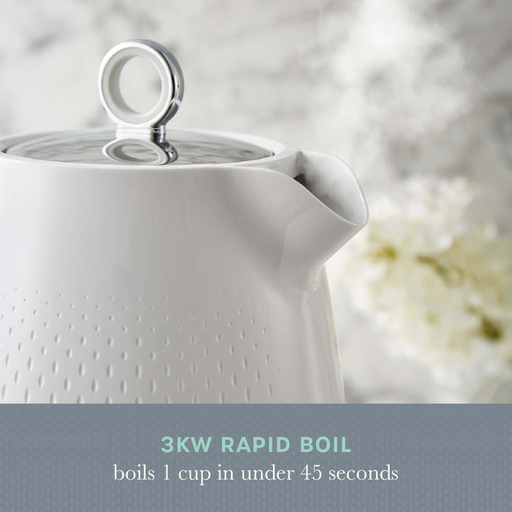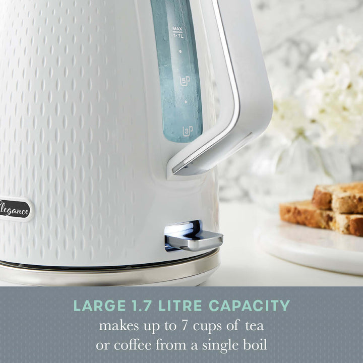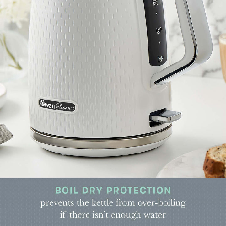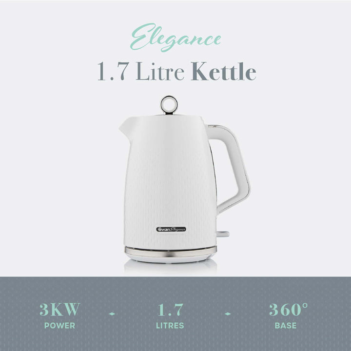 Nothing beats that first cup of coffee in the morning or winding down with a brew after a long day. This white kettle from the new Swan Elegance collection features a premium textured gloss finish to add style to your worktop. The cordless kettle features a large 1.7 litre capacity to make 7 cups on one boil, so you can entertain friends and family with hot chocolates, coffees and teas. Fancy a brew before your next meeting? The 3KW of power rapidly boils water for one cup in under 45 seconds. This Swan SK14016WHT Elegance electric kettle has been designed for convenience thanks to the pull up lid, providing a safe and hassle-free way to refill. Boil dry protection keeps your kettle from over boiling if there isn't enough water, helping avoid damage. After boiling, the kettle switches off automatically for extra safety in family homes. Creating a nice warm drink has never been easier. The Swan Elegance collection's distinctive design is the perfect addition if you are looking to freshen up your kitchen decor.