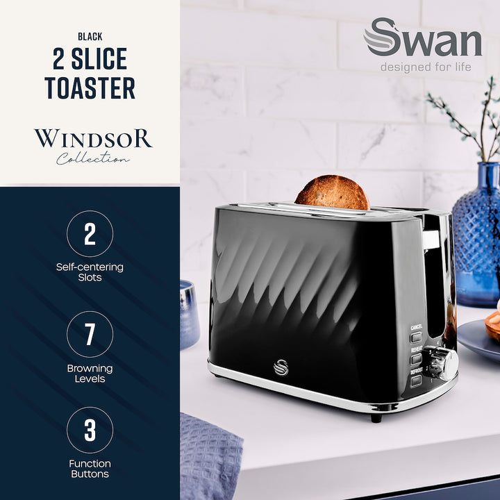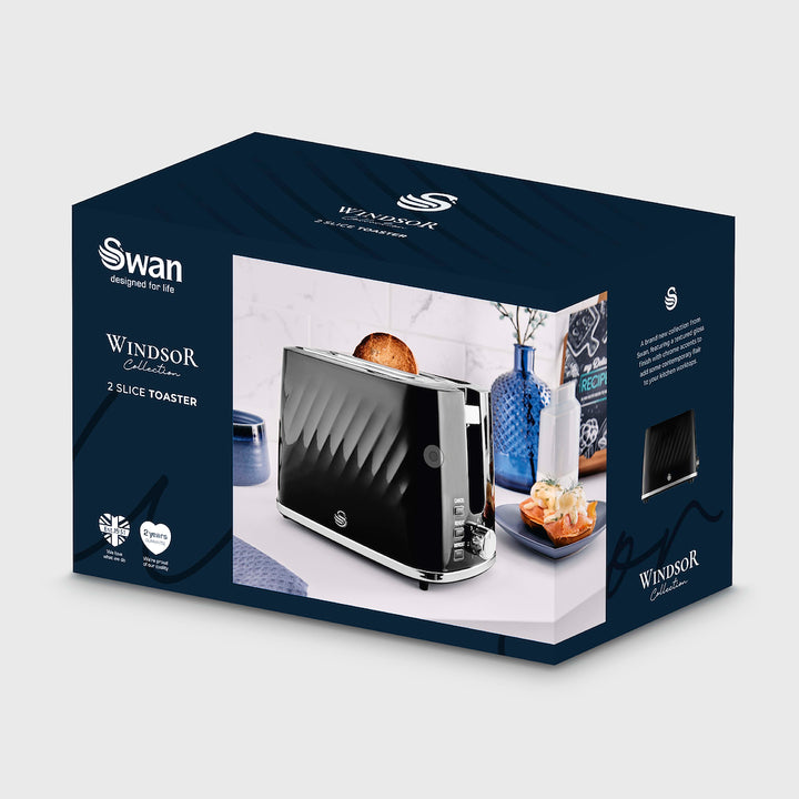 This ST14071BLK black 2-slice toaster from the brand new Swan Windsor collection features a textured gloss finish, complete with chrome accents to add subtle contemporary flair to your kitchen. The...