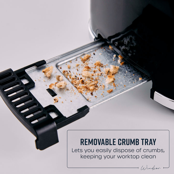This ST14071BLK black 2-slice toaster from the brand new Swan Windsor collection features a textured gloss finish, complete with chrome accents to add subtle contemporary flair to your kitchen. The two large slots can fit different sized slices of bread, muffins, crumpets, and bagels, all perfectly toasted thanks to the seven different browning levels to choose from. It also features a handy defrost function, which lets you toast straight from frozen in minutes - helping you save money and avoid food waste. Been distracted with a task and now your toast has gone cold? Then the reheat function returns your food back to the optimal temperature without burning it, ready to eat again. This Swan toaster also has a removable crumb tray for easy cleaning and integrated cord storage to keep your worktop neat and tidy, while the anti-jam function prevents fire. The non-slip feet provide added stability. It's the perfect addition to your kitchen collection.