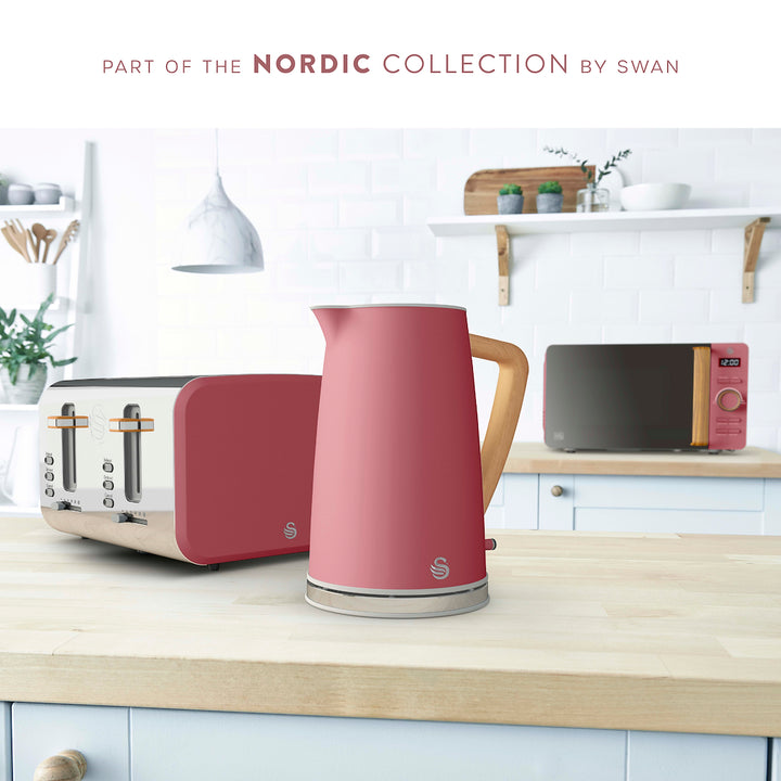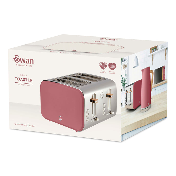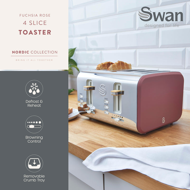 Start your morning off right with a delicious breakfast using the Swan Nordic ST14620FUS fuchsia rose 4-slice toaster. Whether it's toast, muffins, crumpets or bagels, get perfect results customised to your liking thanks to six adjustable browning levels. You can also toast four rounds at one time, perfect for a busy household. Toast gone cold? Just press the reheat button and your food will heat up without burning, ready to eat again. Freezing bread is a great money saver and food waste solution, but what if you fancy a quick snack? Just press defrost after the toast is pushed down and your bread will be ready to eat from frozen within minutes. To keep your kitchen worktop nice and tidy, this fuchsia rose toaster features removable crumb trays to easily dispose of crumbs and integrated cord storage. Includes non-slip rubber feet for added stability. The Swan Nordic collection is inspired by Scandinavian minimalist design, featuring neutral colour schemes and wood-effect accents to compliment any home decor.
