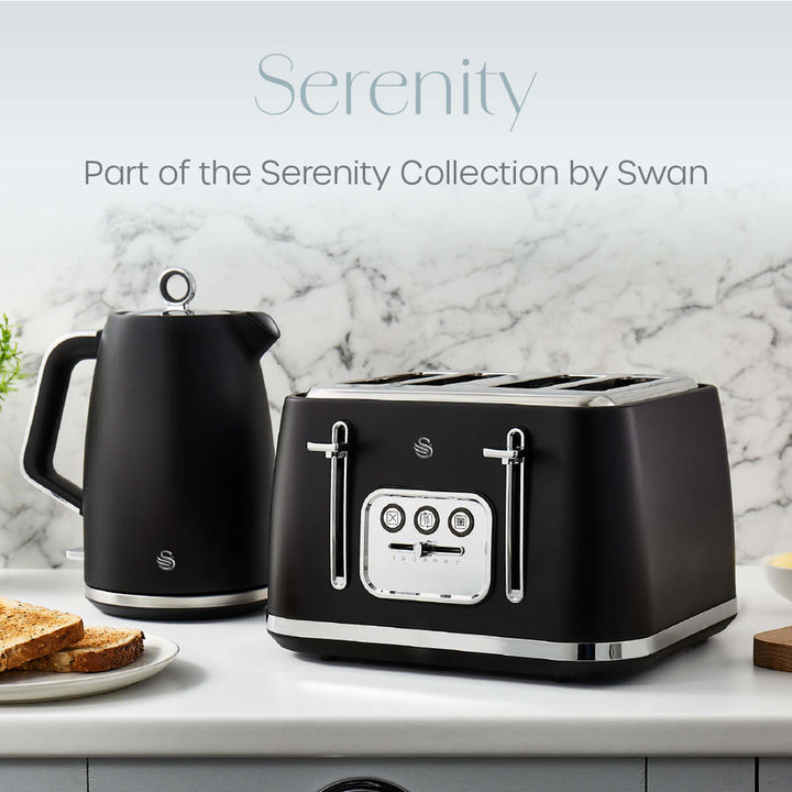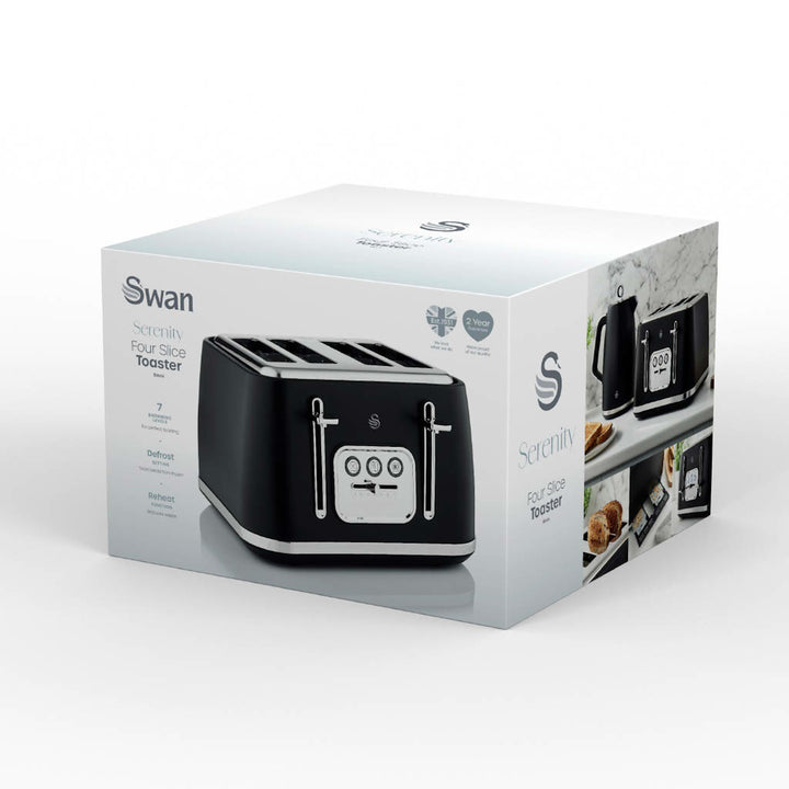 Make perfect toast every time with the Swan Serenity ST19024BLK 4-slice toaster. If you live in a busy household, toast four slices of bread, muffins, crumpets, bagels and more at one time, removing the stress of getting everyone out the door. Some baked goods need the right time toasting to get the best possible results, this black toaster features six adjustable browning levels, so your food is the perfect consistency. Has your toast gone cold? Reheat brings food back to its optimal temperature at the touch of a button without burning, so it's ready to eat again. Freezing bread is a great way to help save money and avoid food waste, but what if you want a quick snack? Press the defrost button after the toast is pushed down and your bread will be ready to eat from frozen in minutes. To keep your kitchen worktop nice and tidy, the removable crumb tray lets you easily dispose of crumbs and integrated storage. Our new Serenity collection encompasses our signature Swan design with contemporary matt finish.