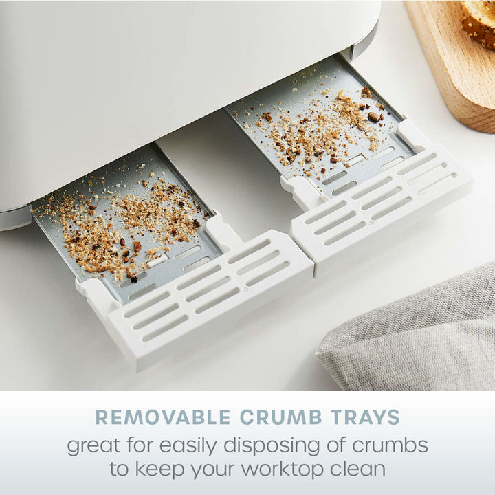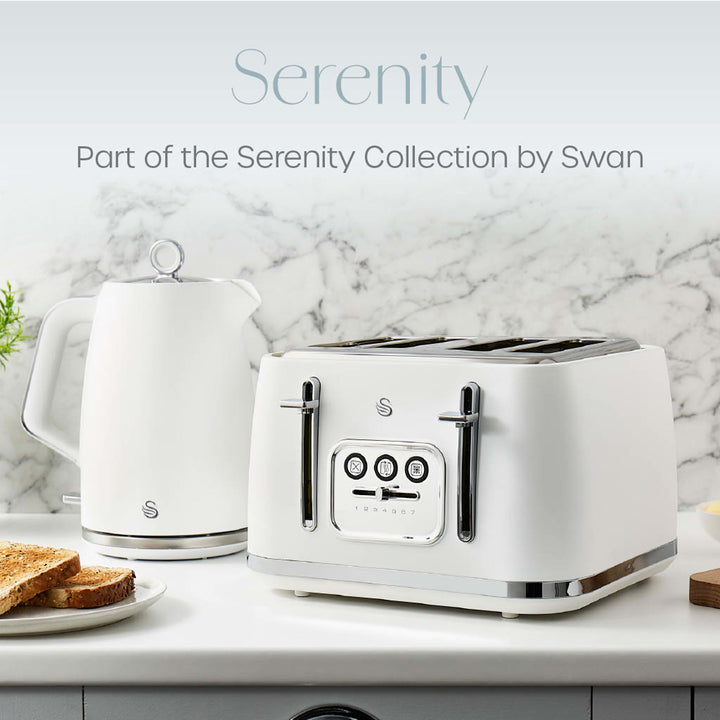 Make perfect toast every time with the Swan Serenity ST19024WHT 4-slice toaster. If you live in a busy household, toast four slices of bread, muffins, crumpets, bagels and more at one time, removing the stress of getting everyone out the door. Some baked goods need the right time toasting to get the best possible results, this white toaster features six adjustable browning levels, so your food is the perfect consistency. Has your toast gone cold? Reheat brings food back to its optimal temperature at the touch of a button without burning, so it's ready to eat again. Freezing bread is a great way to help save money and avoid food waste, but what if you want a quick snack? Press the defrost button after the toast is pushed down and your bread will be ready to eat from frozen in minutes. To keep your kitchen worktop nice and tidy, the removable crumb tray lets you easily dispose of crumbs and integrated storage. Our new Serenity collection encompasses our signature Swan design with contemporary matt finish.