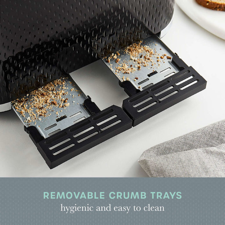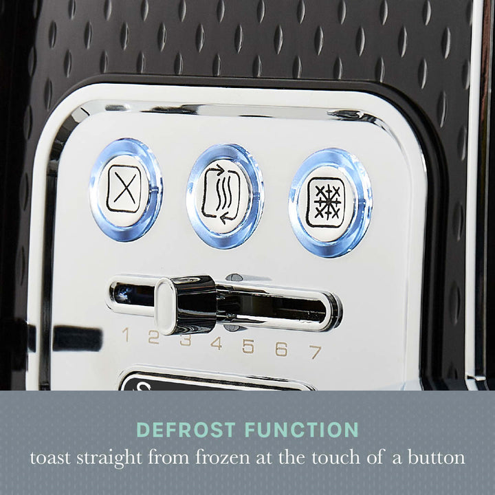 Brighten your breakfast time with a touch of contemporary flare using this Swan ST19025BLK 4-slice toaster, featuring new signature Elegance gloss finish and chrome accents. Designed for the busy household, there are four compartments to make four slices at once. Whether it's bread, muffins, crumpets or bagels, they all need a certain temperature to be perfectly toasted. This black toaster features 7 browning levels, so you can make the perfectly toasted snack to your liking. It also comes with a defrost function for toasting straight from frozen in minutes - a great way to save money and avoid food waste. Stuck in a meeting or got distracted with housework and your toast has gone cold? The handy reheat function gets your toast back to the optimal temperature without burning it. This Swan toaster also features a removable crumb tray for easy cleaning and integrated cord storage to ensure your worktop stays tidy, while the anti-jam function prevents fire. It's the perfect addition to your kitchen collection.