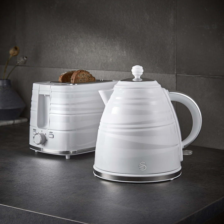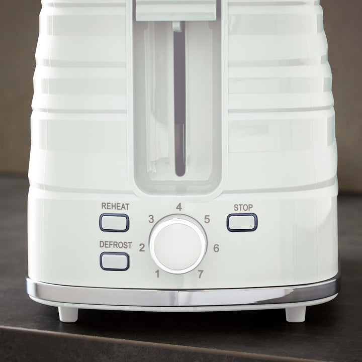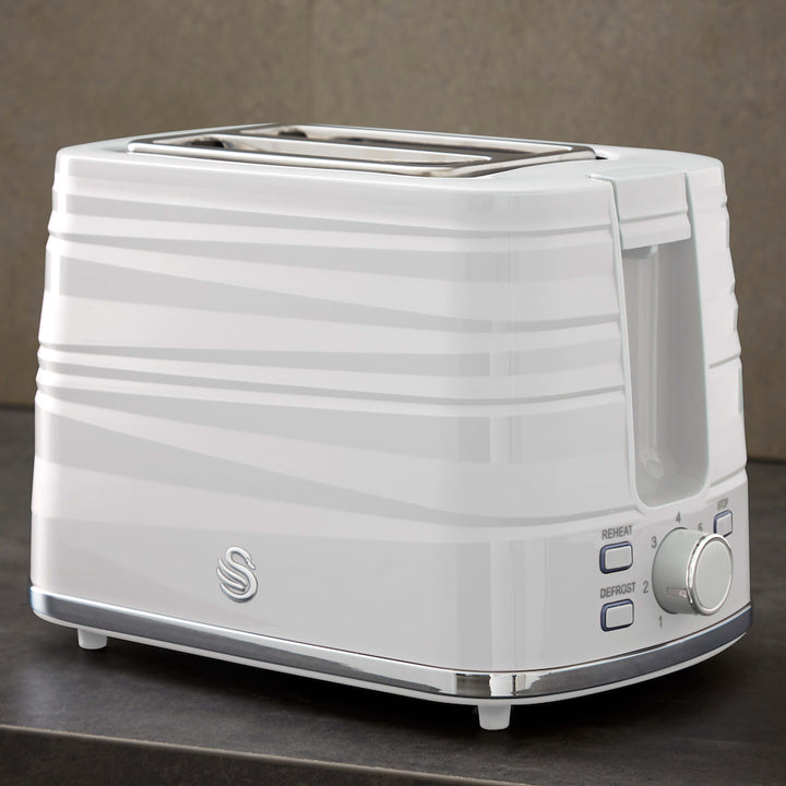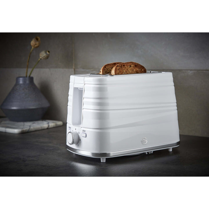 Enjoy a delicious breakfast with this 2 slice toaster from our Swan Symphony collection. It features 2 variable width slots with 7 browning levels to make perfectly toasted rounds of toast, crumpets, bagels or breakfast muffins suited to your tastes. You can toast straight from frozen, reheat without burning your food or cancel mid-cycle - all at the touch of a button. This toaster also features a removable crumb tray, non-slip feet and cord storage to keep your worktop tidy. Swan Symphony is an elegant and timeless collection that blends delicate textures with a high gloss and matt finish.