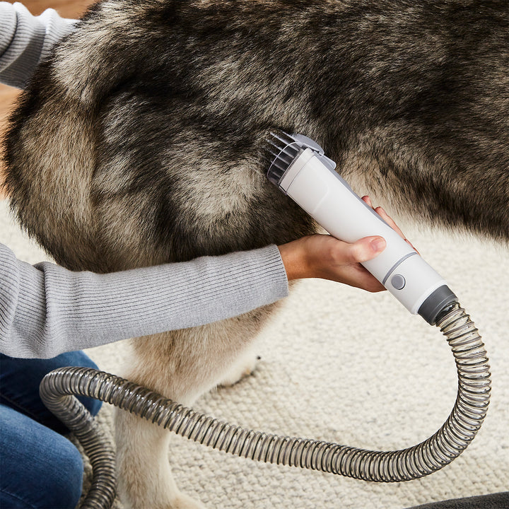 Introducing the Pet Grooming Vacuum Cleaner the ultimate tool for pet grooming at home. This electric clipper with built-in suction comes with four guards (3mm, 9mm, 16mm, and 24mm) for precise trimming. The vacuum collects 99% of hair, leaving your home hair-free. The Grooming Brush and De-Shedding tool removes loose hair, leaving your pet's fur hiny and tangle-free. The 2-in-1 paw/upholstery brush removes dirt and hair from paws and upholstery. The vacuum has a large dust tank, crevice tool , and three-speed settings for powerful suction. with the Perfect Pet Grooming Vacuum Cleaner.