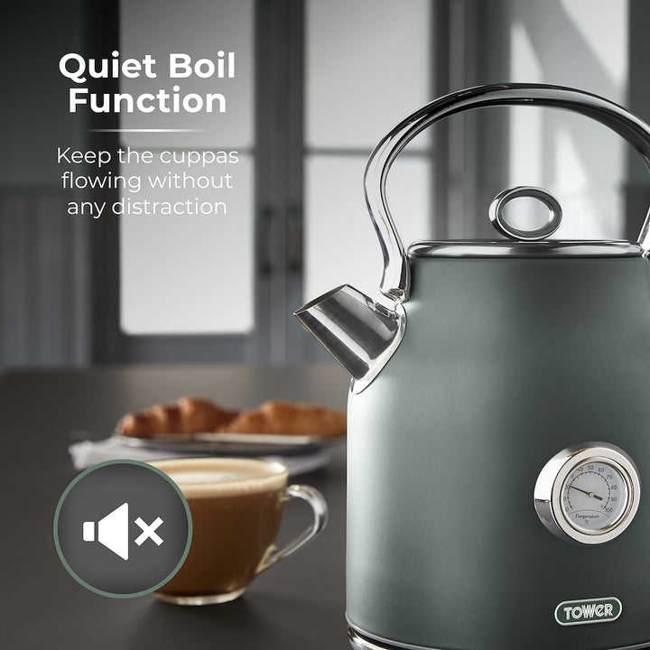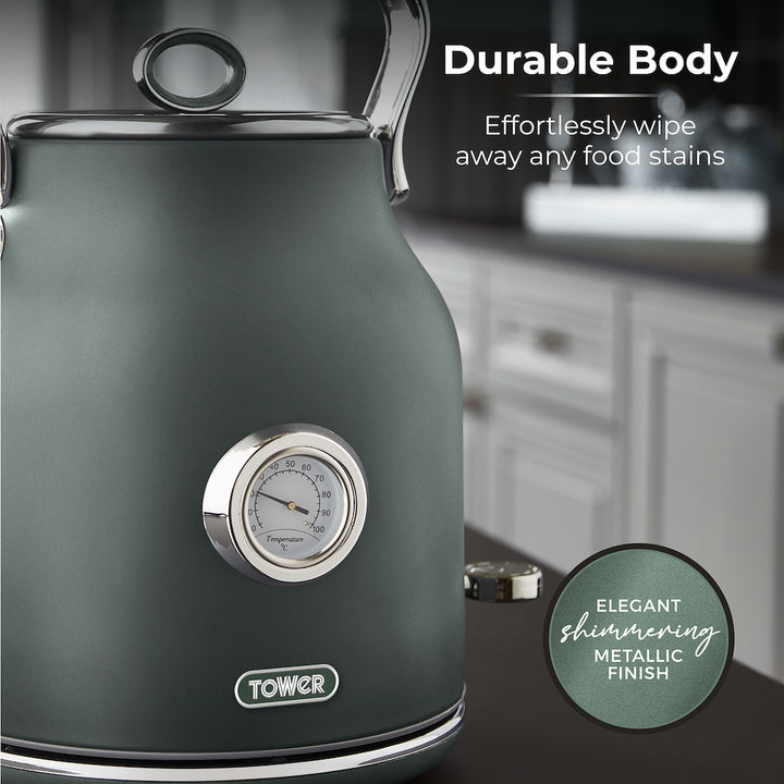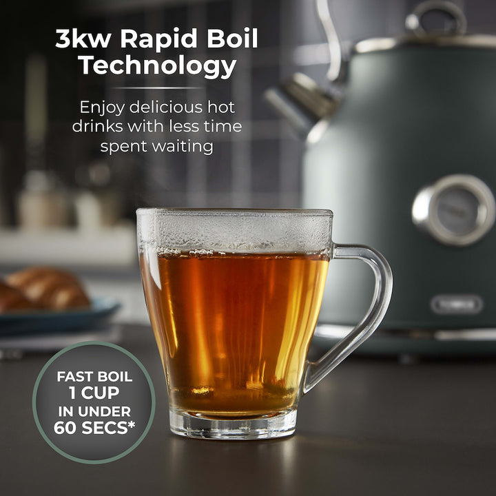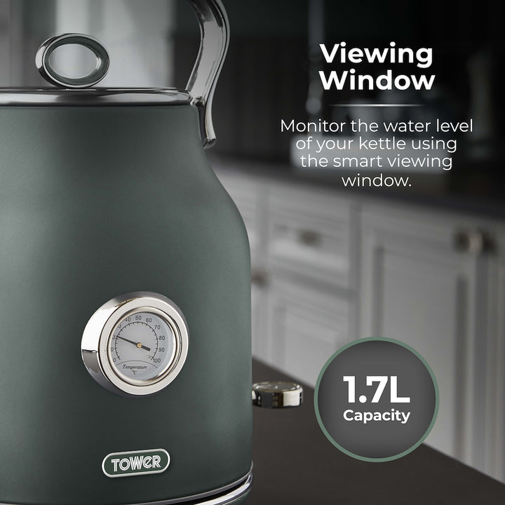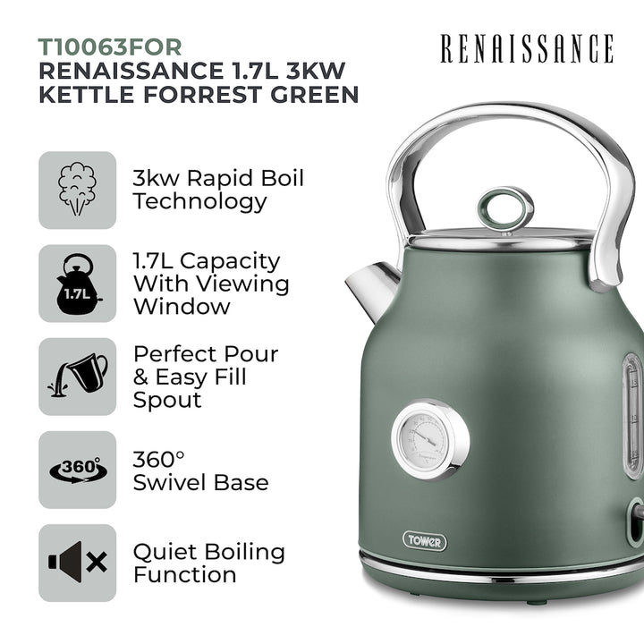 Boil the perfect brew in less than a minute with the Tower Renaissance 3KW Forest Green Kettle. The 1.7L capacity lets you make up to 7 cups of tea or coffee from one fill, perfect when hosting your family and friends.