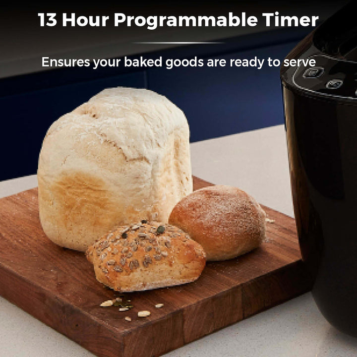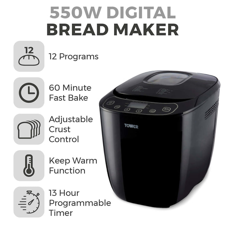 ake a delicious loaf of bread in no time with this Tower Digital Bread Maker. It features 12 automatic programs, which offer a variety of options for baking white bread, French bread, wholemeal bread and an ultra-fast function to make a loaf in under an hour.