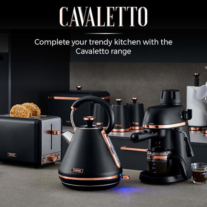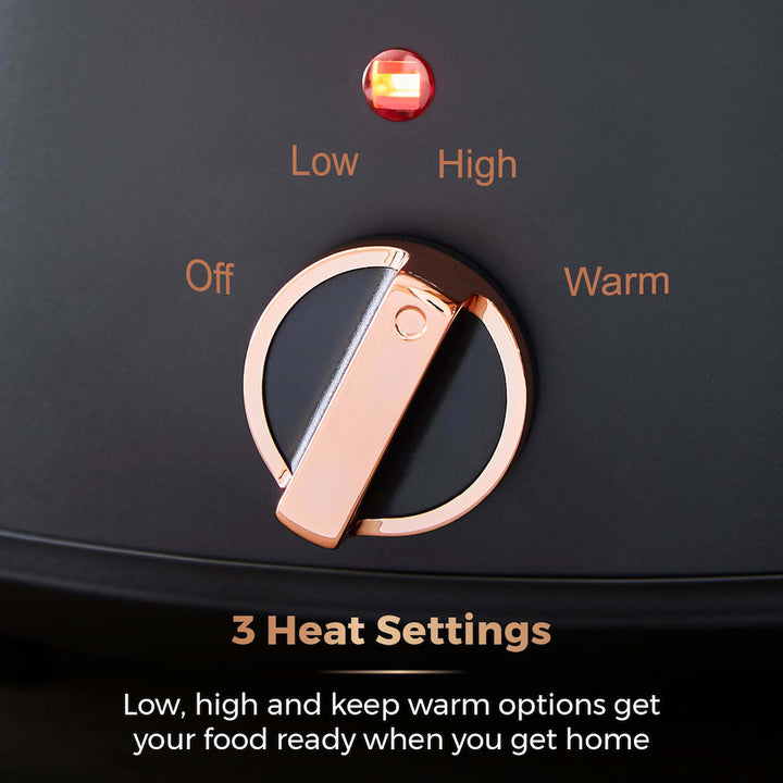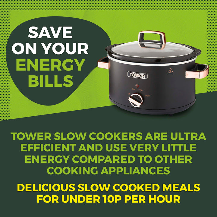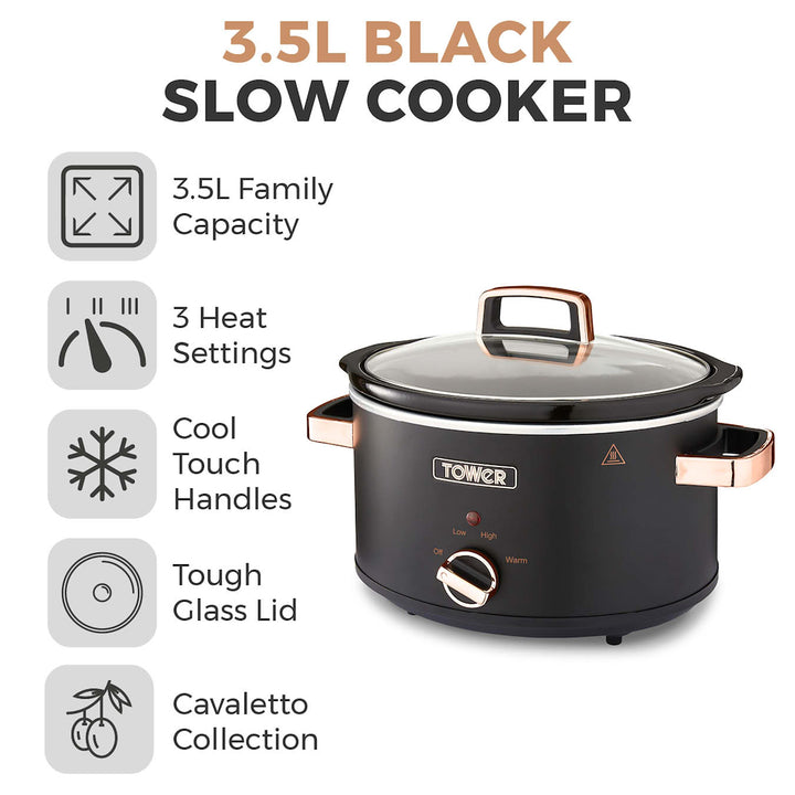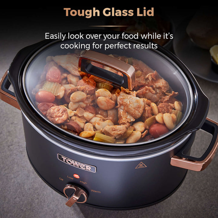 This Tower Cavaletto 3.5 litre slow cooker is a great and cost-effective way to make deliciously healthy meals for all the family. There are three different heat settings to choose from - low, high and keep warm - so you can cook a range of dishes, including casseroles, soups, stews, curries and even bread, all ready when you get home in the evening. This slow cooker features a large 3.5 litre capacity, letting you serve to 4-5 people, making it perfect for wholesome family mealtimes. The tough glass lid gives you a clear view of the cooking process, so you get perfect cooking results every time. The crockpot is removable and with the cool to touch handles, you can safely serve straight to the table and after use, simply put it into the dishwasher for easy cleaning. Features a signature Cavaletto design, combining black with subtle rose gold accents to provide a stylish addition to today's contemporary kitchen.
