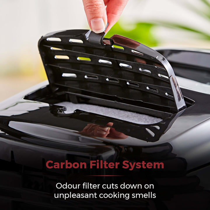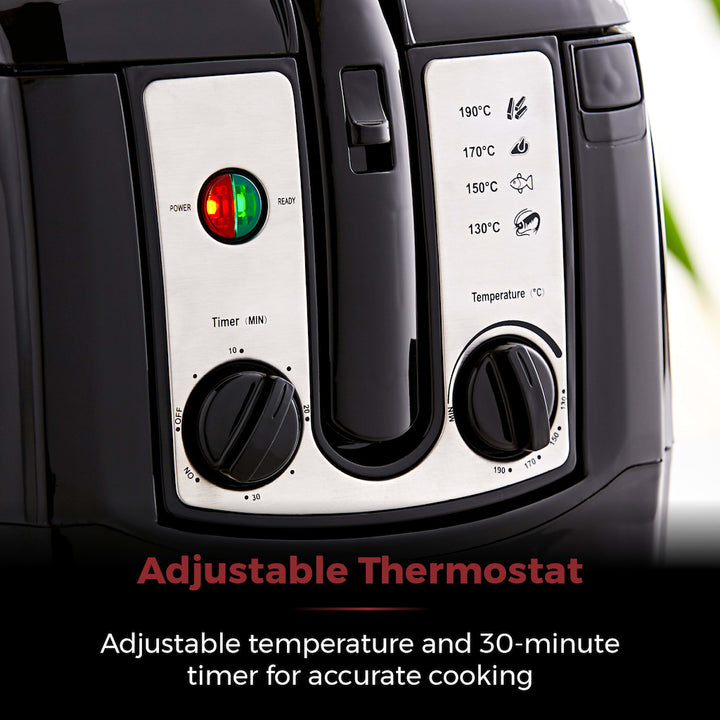 This Deep Fat Fryer is fantastic for cooking fried family favourites with its large 3 litre capacity capable of making up to 6 portions in one go. The adjustable thermostat allows you to cook ingredients accurately, while the durable frying basket is ideal for frying smaller foods such as scampi or chicken pieces. A large viewing window lets you safely monitor your food as it cooks, while the 30-minute mechanical timer ensures perfect results every time. The Deep Fat Fryer offers trouble-free cooking compared to a traditional deep fryer, providing a removable lid and detachable non-stick enamel oil pot for an easier clean. Its folding handle with lifting system lets you lift the frying basket out of the oil without removing the lid for safe and simple handling. Unpleasant fryer odours are also prevented due to its built-in carbon filter, keeping your kitchen smelling fresh after you've finished cooking.