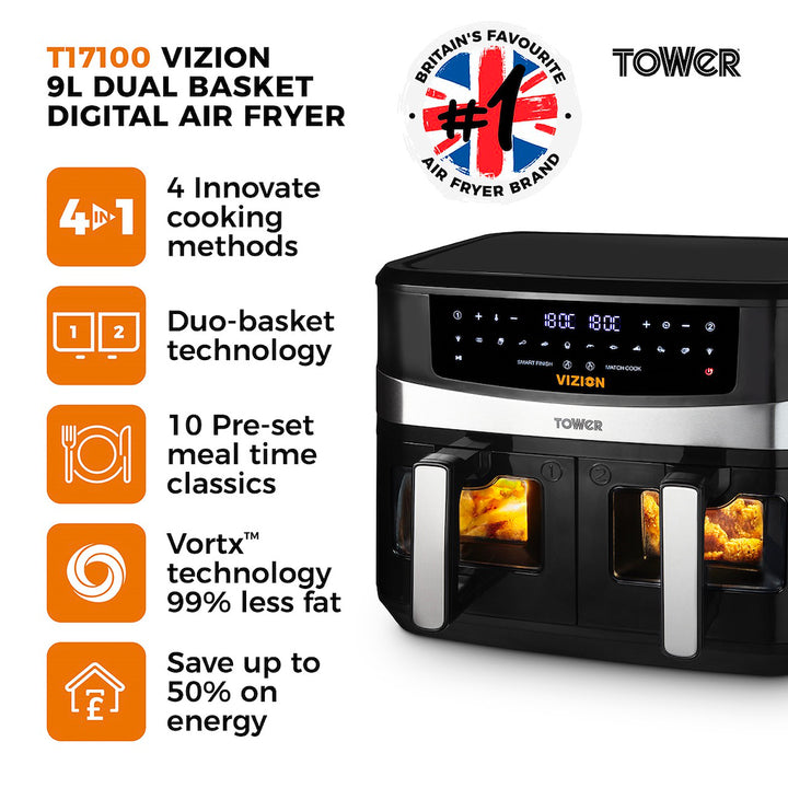 Exclusive to Tower Air Fryers, Vortx technology rapidly circulates hot air around food. Cooking up to 30% faster than a conventional oven and using 99% less oil, allowing you to save up to 50% on your energy. The Dual Drawer Air Fryer boasts two baskets to provide the ultimate in air frying versatility. Giving you the freedom to cook single portions or larger portions, as required.You can cook separate meals simultaneously in the two 4.5L drawers with a combined capacity of 9L, enough to feed 8 people at once. The Smart Finish control will adjust cook times automatically, so that both baskets finish cooking at the same time. You can also choose from 10 one-touch pre-sets to take the guess work out of cooking.