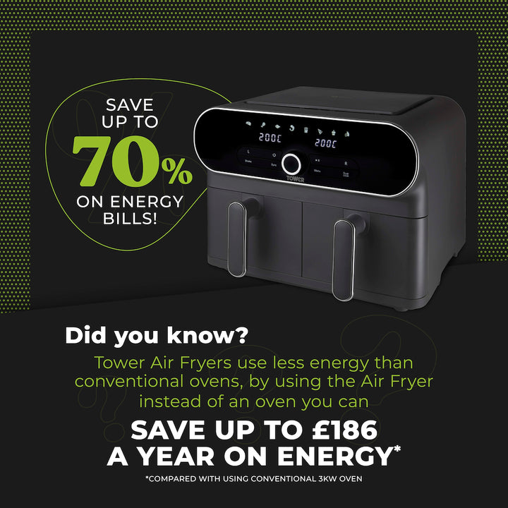 Cook larger meals for the whole family with this 10.4L Dual Basket Air Fryer from Tower. Two 5.2L baskets cook food independently with individual timers and temperature settings for larger portions or cooking multiple food types at once. Featuring Vortx technology, food cooks 30% faster than in a conventional oven, for delicious crispy meals that requires little to no oil. Use the Sync function to set different foods to cook and be ready at the same time, whilst the intelligent Dual Cook function will synchronise cooking settings for cooking larger portions. Choose from 8 cooking presets including Steak, Drumsticks, Fish, Prawns, Fries, Pizza, Cake and Dehydrate for fuss free cooking, whilst the digital control panel makes it simple to cycle through cooking settings and temperatures. The letters SHK appear on the display during cooking, reminding you to shake the basket for a more thorough and even cook. Non-stick removable grill plates offer simple cleaning so cooking is fuss-free from start to finish.