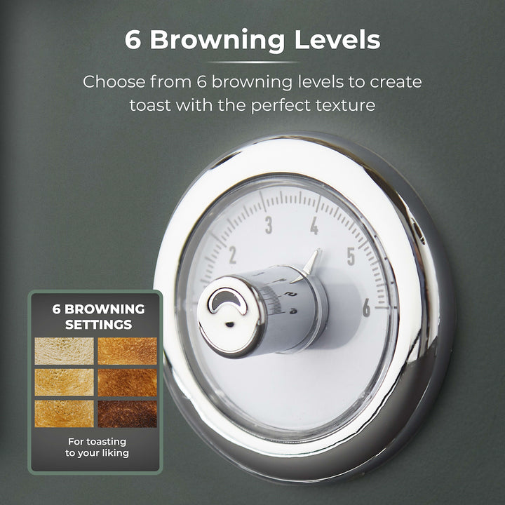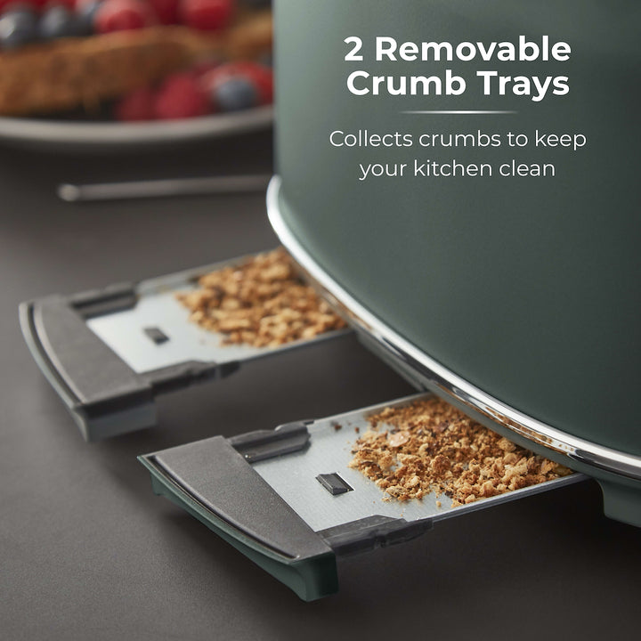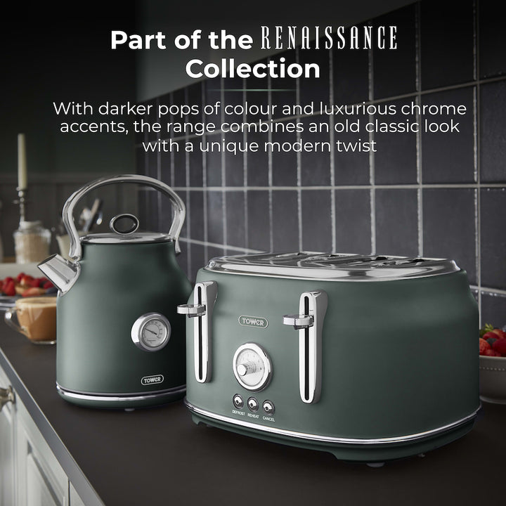 Enjoy toast to your taste every breakfast time with the Tower Renaissance 4 Slice Forest Green Toaster. With its durable body and removable crumb trays, this is the ideal long-lasting kitchen essential that perfectly toasts bread, crumpets and bagels. Simply remove the trays and empty the contents straight into the bin to keep your kitchen tidy. Toast to your taste with the 7 browning levels that can be easily adjusted, alongside the defrost, heat and cancel functions to give you total control over your toasting needs. The stylish design of this toaster will make a statement on your kitchen countertop, adding a touch of elegance to your electrical appliances and fits perfectly with the Tower Renaissance Forest Green Kettle.